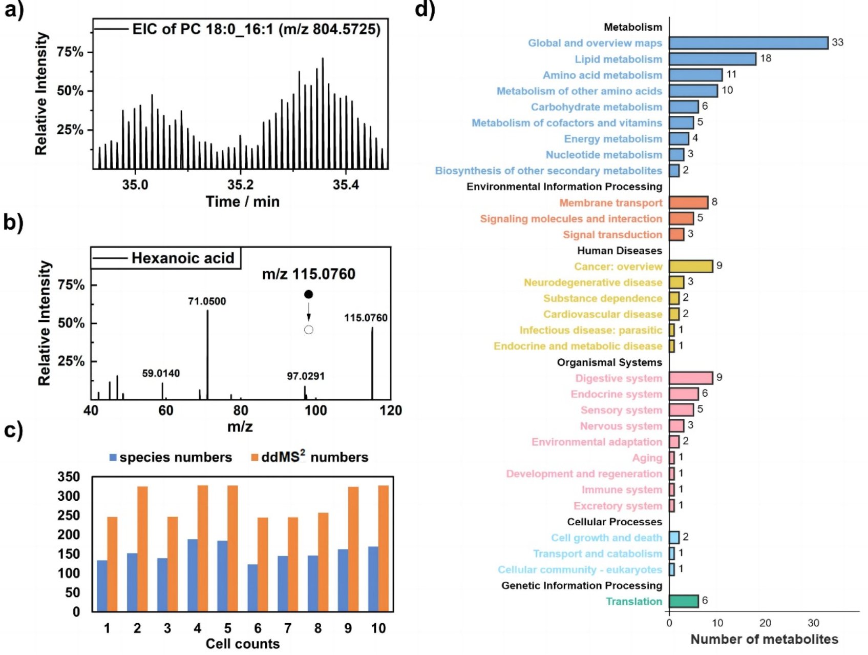 The in-depth organic mass cytometry platform consists of an on-line high-efficiency single-cell lysis device and non-contact electrospray high resolution mass spectrometry analysis. The cell suspension was pumped into the inner ordering capillary in which single-cell sorting was achieved via Dean flow. The sheath fluid capillary is coaxially connected with the separation capillary through a T-value. Low-energy ultrasonication was employed to realize online cell lysis after mixing the cell solution with sheath fluid. Notably, ice bath conditions were used to prevent metabolite degeneration caused by the heating effect from continuous ultrasonication. With continuous single cell injection, an average analysis time of about 24 seconds per single cell can be obtained, which can effectively acquire high-resolution MS and MS/MS information. The substantial MS/MS data also enables the identification and relative quantification of isomers (Fig. 2).