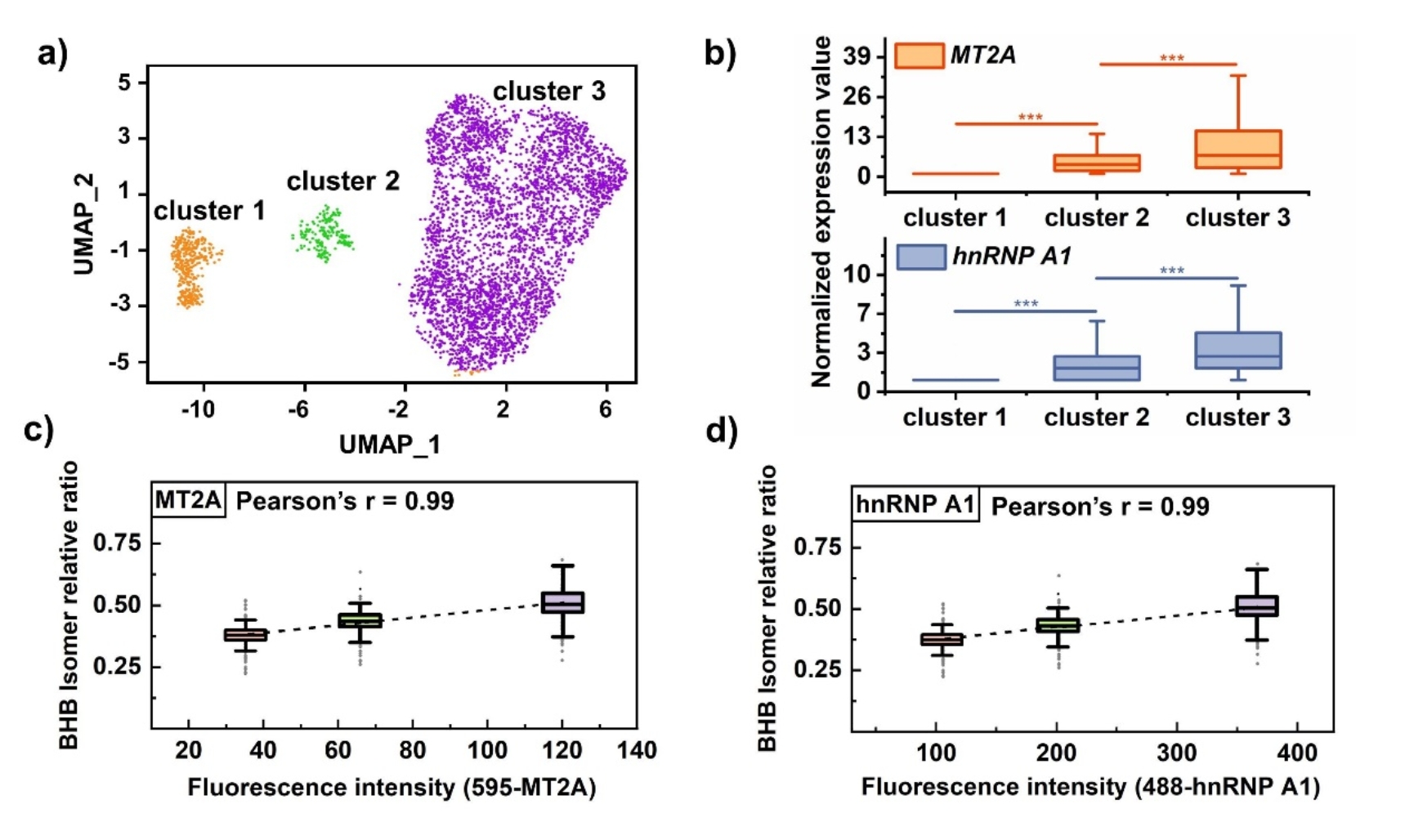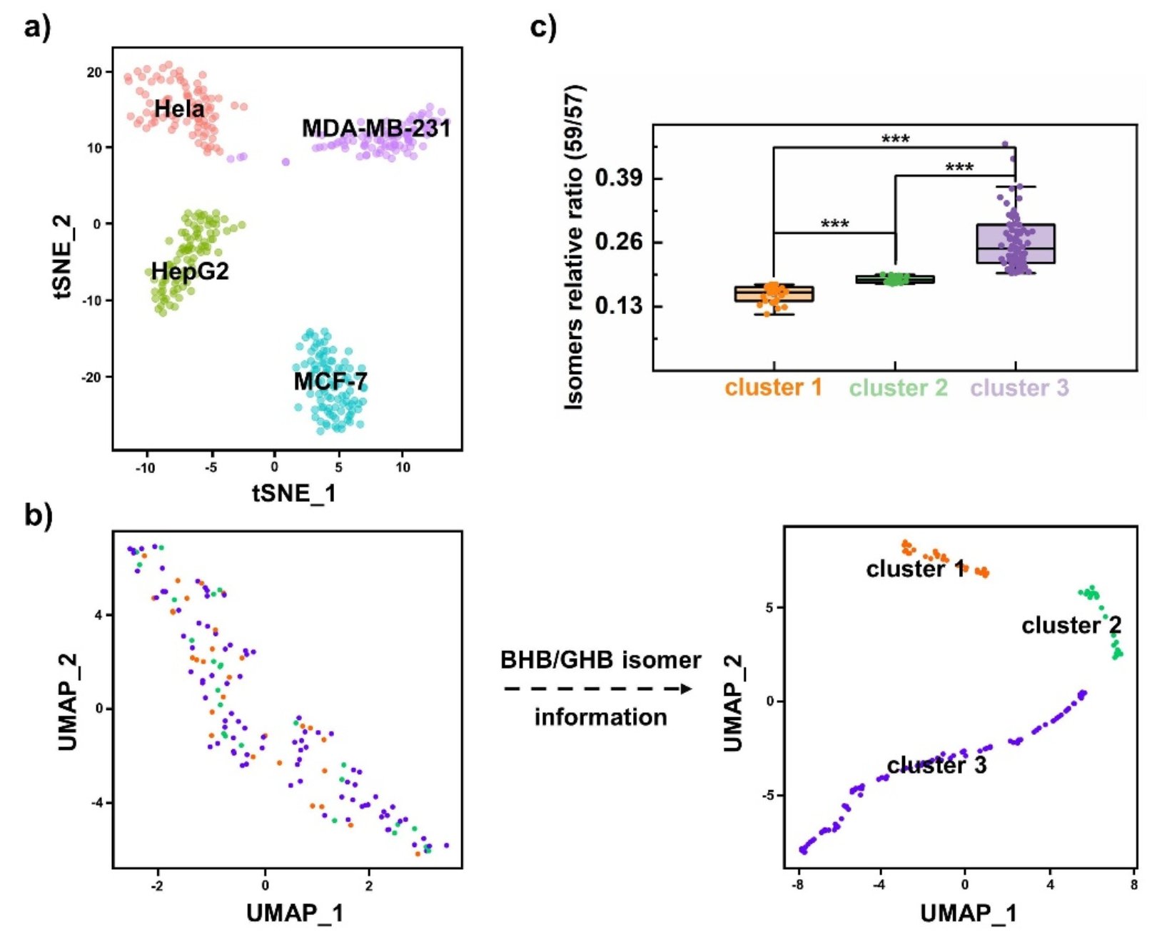 Based on the metabolite information of different types of tumor cells, the platform demonstrates the universal cell typing capabilities. Using the relative content of 3-hydroxybutyric acid/4-hydroxybutyric acid isomers, three subtypes of MCF-7 cells were successfully distinguished by UMAP visualization method. Combined with the 10×Genomics single cell sequencing analysis, western blot assay and fluorescence activated cell sorting assay, this study confirmed that the abundance difference of 3-hydroxybutyric acid was the main reason of tumor cell subtyping from the transcriptomic level and protein expression level, and 3-hydroxybutyric acid was positively correlated with the expression levels of various downstream anti-oxidative stress target proteins, such as, metallothionein MT2A and heterogeneous ribonucleoprotein hnRNP A1. These findings suggest that variations in 3-hydroxybutyric acid abundance may confer different abilities on tumor cells to resist oxidative stress environments. This work observed potential cell subtypes of MCF-7 cells for the first time, offering a new approach to understanding tumor heterogeneity and advancing precise therapy for breast cancer.