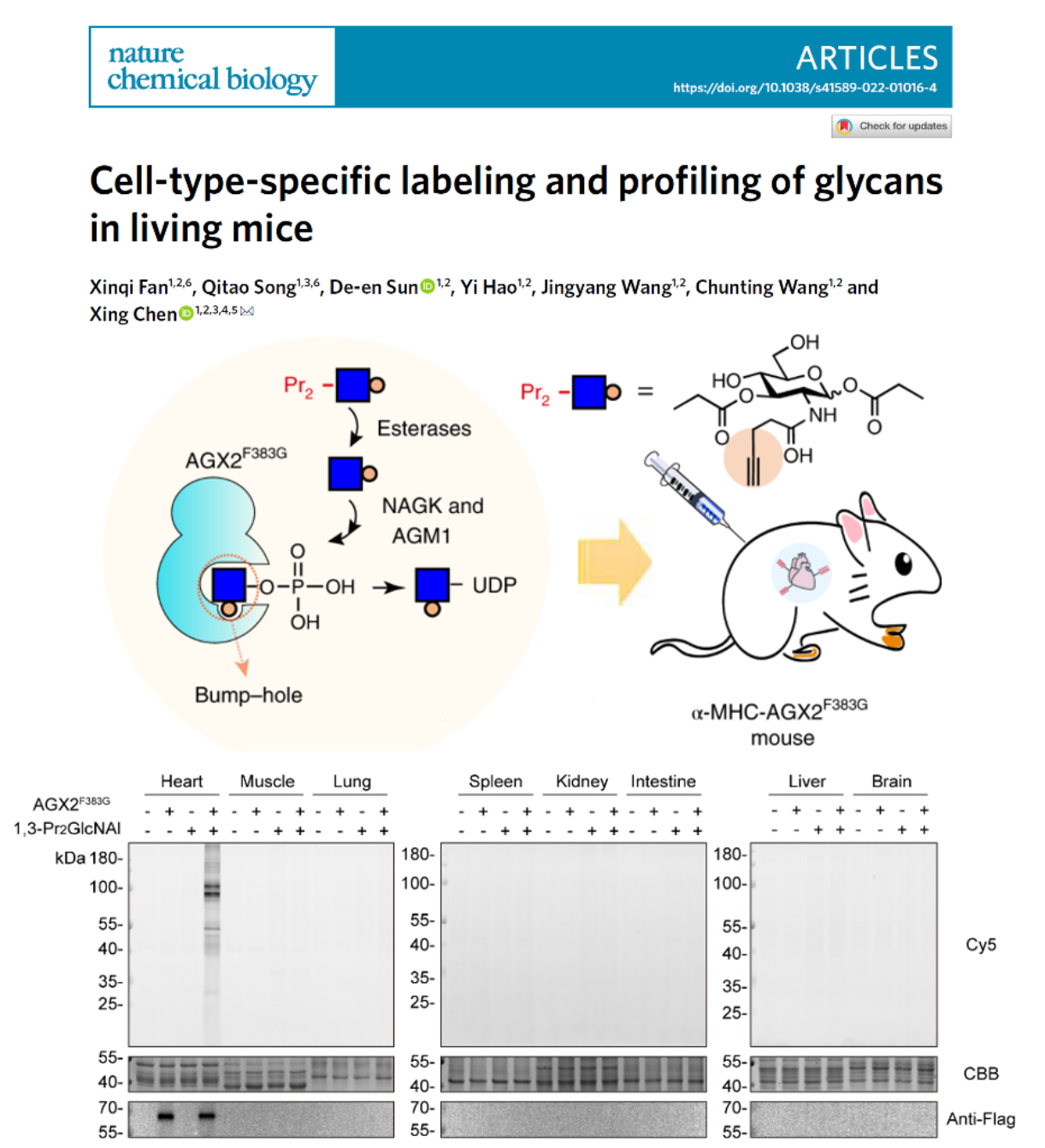 Prof. Xing Chen’s Group at College of Chemistry and Molecular Engineering and Center for Life Sciences, Peking University reported genetically encoded MGL (GeMGL), which leverages the bump-and-hole approach for an orthogonal engineered enzyme–unnatural sugar pair, providing binary stringency for cell-specific glycan labeling in live cells and living mice. N-pentynylacetylglucosamine (GlcNAl) containing a linear propargyl group as the bump was paired with a mutant form of UDP-GlcNAc pyrophosphorylase, AGX2F383G, for specific incorporation into glycans of cells expressing AGX2F383G.