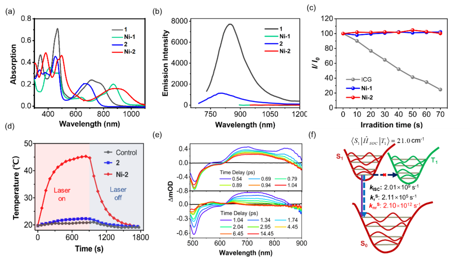 The complexes feature intense NIR absorption bands in the near-infrared (NIR-I and NIR-II) biowindow, demonstrating high photostability and excellent photoacoustic and photothermal effects with a photothermal conversion efficacy of 58.0% (Fig. 2). Additionally, the inherent excited-state dynamics and energy dissipation pathway of 3d metal complexes made them potential photothermal agents. The in-depth study using ultrafast TA spectroscopy supported by theoretical calculations provided that under NIR irradiation, the energy dissipation process in Ni-2 is mainly in the form of non-radiative transition.