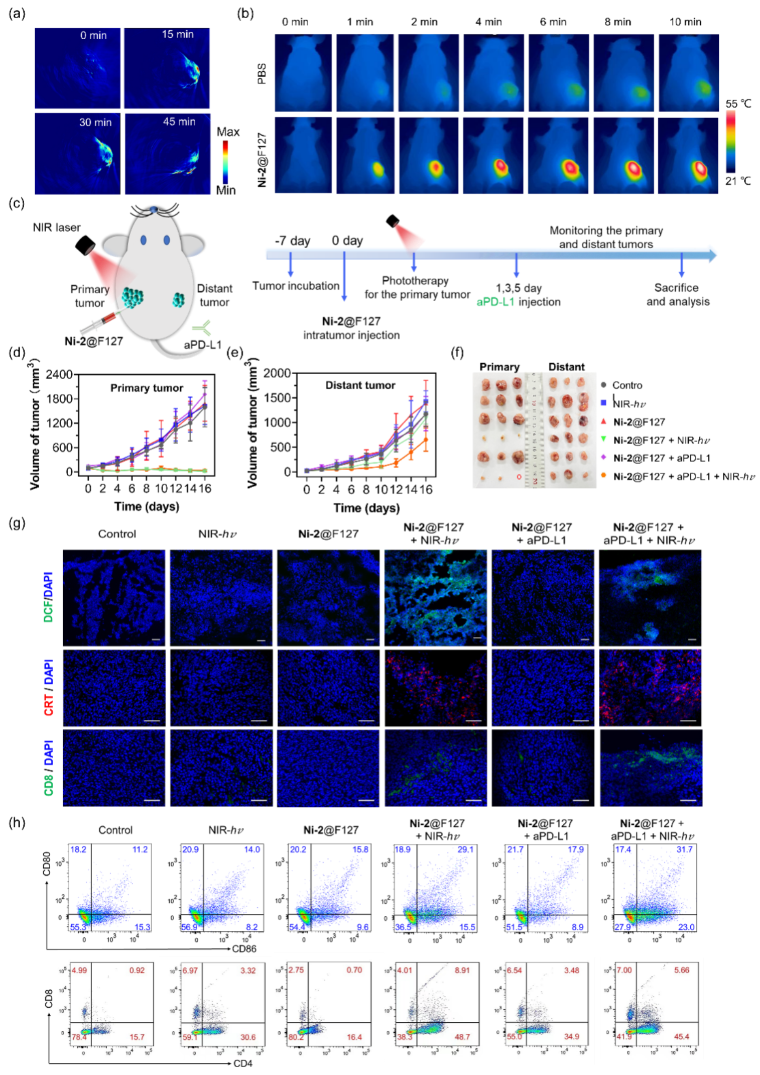 As a multifunctional phototherapy reagent, Ni-2 was found not only to accurately locate tumor sites through photoacoustic imaging and inhibit tumor growth in a CT26 tumor-bearing mouse model, but also to activate an immune response via a combination of photothermal- and H2O2-induced effects. Upon photoirradiation, it could not only generate heat but also produce cytotoxic •OH, disrupt intracellular redox homeostasis, and promote ICD induction, as reflected in DC maturation, T cell infiltration, and cytokine secretion. Further study revealed that Ni-2@F127-mediated phototherapy induces a systemic immune response and could synergize the effect of aPD-L1 in suppressing tumor immune evasion (Fig. 4). Collectively, the present results provide support for the proposition that Ni-2 or its analogues could emerge as useful tools for photoimmunotherapy, as well as supply a new strategy for the design and application expansion of molecular probes for 3d metal therapy.