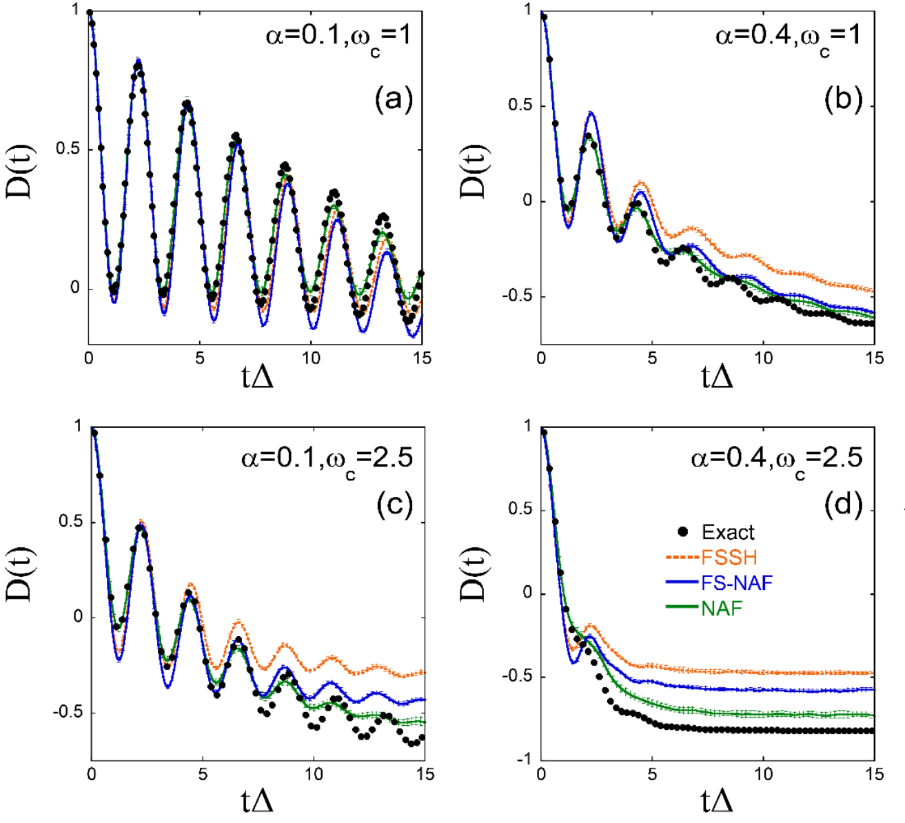 Fig. 4 Population difference between two states as a function of time for spin-boson models with Ohmic spectral density at low temperature (β=5)."The coupling between the two states is Δ=1. The Kondo parameter α and the cut-off frequency ωc are (a): α=0.1, ωc=1; (b): α=0.4, ωc=1; (c): α= 0.1, ωc=2.5; and (d): α=0.4, ωc=2.5, respectively. Black points: Exact results of quantum mechanics; Orange dashed lines: fewest-switches surface hopping (FSSH); Blue solid lines: FS-NAF (NAF strategies used in FSSH); Green solid lines: NAF.