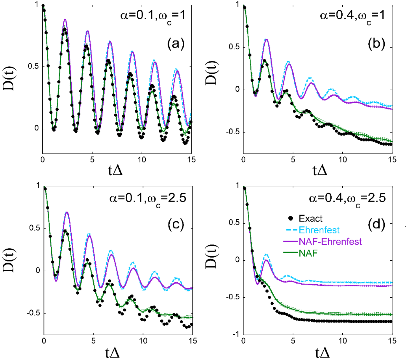 Fig. 3 Population difference between two states as a function of time for spin-boson models with Ohmic spectral density at low temperature (β=5). The coupling between the two states is Δ=1. The Kondo parameter α and the cut-off frequency ωc are (a): α=0.1, ωc=1; (b): α=0.4, ωc=1; (c): α= 0.1, ωc=2.5; and (d): α=0.4, ωc=2.5, respectively. Black points: Exact results of quantum mechanics; Cyan dashed lines: Ehrenfest dynamics; Purple solid lines: NAF-Ehrenfest (NAF strategies used in Ehrenfest dynamics); Green solid lines: NAF.