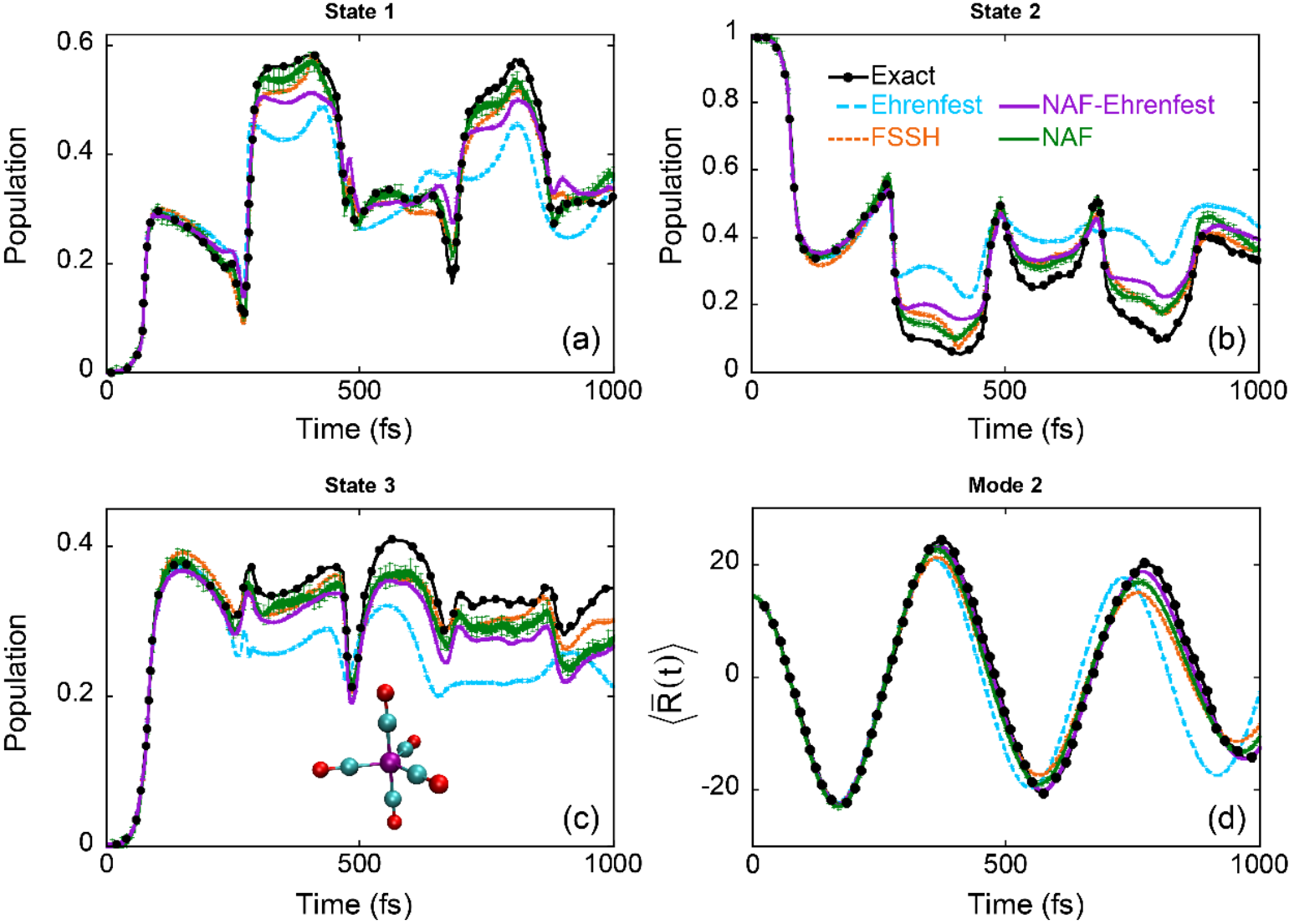 Fig. 6 Results of the conical intersection model for Cr(CO)5 molecule. (a)-(c): Electronic population dynamics of each electronic state; (d): Nuclear coordinate dynamics. Black lines with black points: Exact result of quantum mechanics; Cyan dashed line: Ehrenfest dynamics; Orange dashed line: fewest-switches surface hopping; Purple solid line: NAF-Ehrenfest (NAF strategies used in Ehrenfest dynamics); Green solid line: NAF.