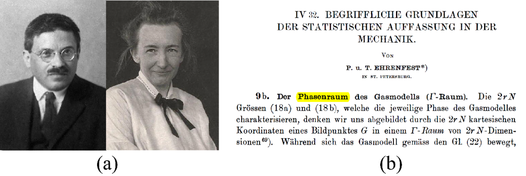 Fig. 1 (a) Paul Ehrenfest and Tatyana Ehrenfest (image source: Wikipedia); (b) The original article where the Ehrenfest couple first used the term, phase space (“Phasenraum”) (Ehrenfest, P.; Ehrenfest, T. Begriffliche Grundlagen Der Statistischen Auffassung in Der Mechanik. In Encyklopädie Der Mathematischen Wissenschafte, B. G. Teubner: Liepzig,Germany, 1911; Vol. 4, pp 1-90).