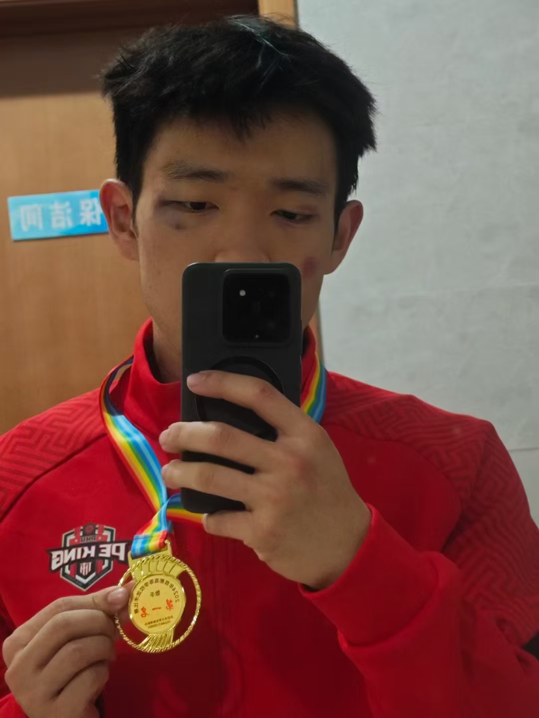 The cruelty of competitive athletics manifests in the direct proportionality between trophy weight and sweat expended. At my debut 2023 National Collegiate Wushu Sanda Championship, after overcoming numerous obstacles to reach the finals, I lost the gold medal due to flawed tactics and hesitant execution. In the subsequent year, I intensified Sanda training to over 10 hours a week while maintaining functional conditioning. Moreover, a true martial artist must temper not only muscle memory but also tactical cognition. During drills, I constantly visualized opponents and committed fully to each movement. This dedication bore fruit a year later when I successively claimed titles including Beijing Collegiate Champion and National Collegiate Champion.