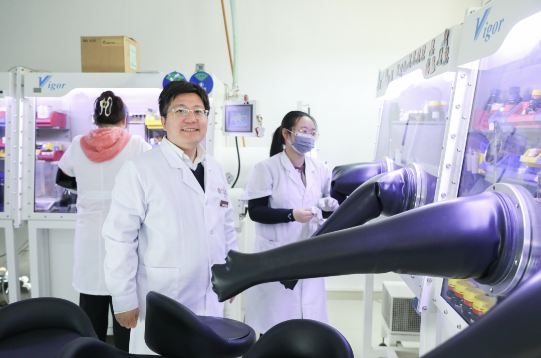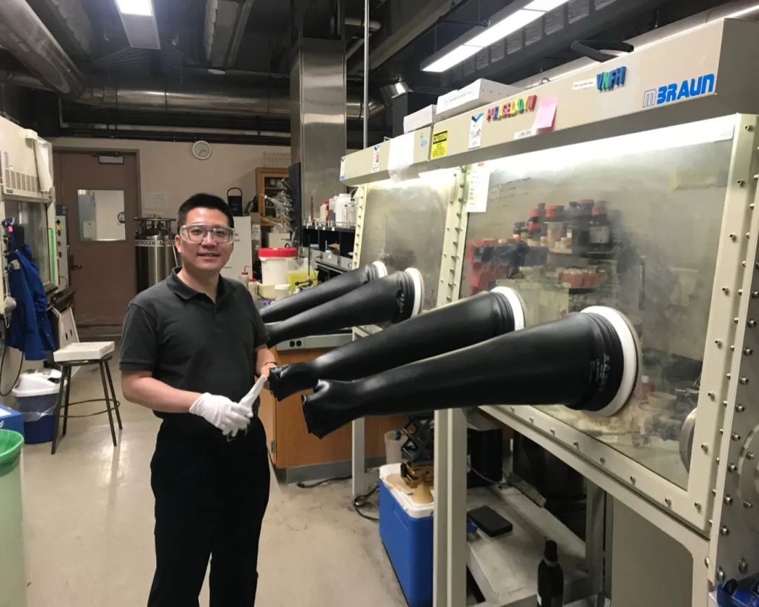▲Wenliang Huang in front of his glove-box in the Laboratory at UCLA