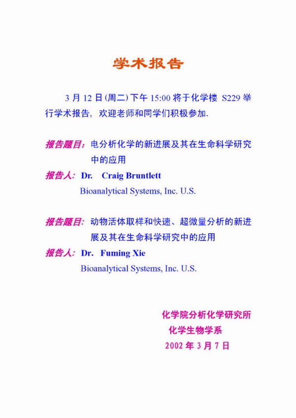 Dr. Craig Bruntlett and Dr. Fuming Xie from Bioanalytical Systems. Inc. US delivered lectures.
