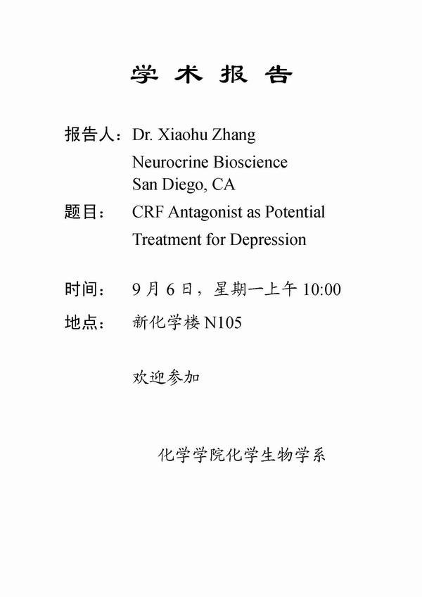 Dr. Zhang Xiao Hu, Neurocrine Bioscience, San Diego, CA, USA will present a talk on September 6. More>>