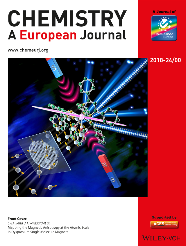 但是这种单晶磁化率测试的手段具有明显的局限性,只适用于极个别的对称性情况,对于分子与晶体的各向异性轴不重合的情况下,无法严格确定分子磁轴取向(Chem.-Eur. J., 2013, 19, 13726)。为解决此问题,蒋尚达与丹麦Aarhus大学的Jacob Overgaard博士等合作,采用极化中子衍射(Polarized Neutron Diffraction)的方法,解决了任意空间群中低对称性磁性离子的磁轴取向测定问题,该工作以封面文章的形式发表在《欧洲化学》杂志上,并被选为VIP文章(Chem.-Eur. J., 2018, 24, 16576)。