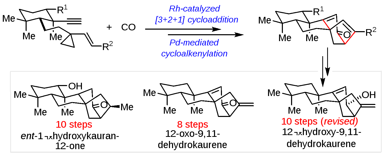对映-贝壳杉烷类(ent-kaurane)二萜是一大类具有抗菌、抗病毒、抗肿瘤等多种重要生物活性的四环二萜天然产物,目前已有超过1000成员被分离、鉴定出来。由于复杂的结构和潜在的生物活性,该类型天然产物吸引了合成化学家的广泛关注。国内外众多著名的有机化学家都对该类分子进行了合成研究,目前报道的合成方法大都需要多步构建其四环骨架,尤其是[3.2.1]双环骨架。