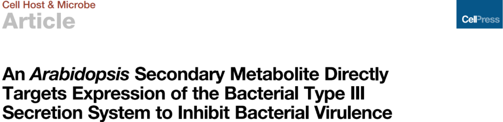 2020年4月8日,3003新葡官方网站3003新葡官方网站雷晓光课题组与合作者中国科学院遗传与发育生物学研究所周俭民课题组、国家蛋白质中心杨靖课题组共同在Cell子刊《Cell Host&Microbe》杂志上发表了题为“An Arabidopsis secondary metabolite directly targets expression of the bacterial type III secretion system to inhibit bacterial virulence”的文章,阐明了植物通过产生异硫氰酸酯类小分子天然产物Sulforaphane(SFN)特异性抑制植物病原菌III型分泌系统,从而达到“不战而屈人之兵”的有效抗菌策略。该研究发现了植物内源天然产物在植物与微生物相互作用中所扮演的重要角色,揭示了新颖的生物作用机制,为植物保护提供了新的研究思路。