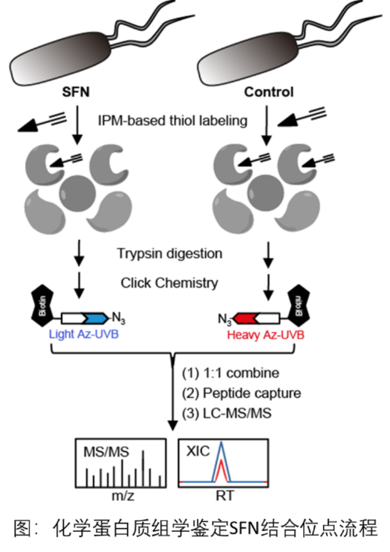 为了阐明SFN的明确生物作用机制,他们进一步通过转录组分析以及化学蛋白质组学鉴定出了SFN分子的相互作用靶点蛋白和具体作用位点(图三)。SFN具有亲电性的异硫氰基,能够通过加成反应共价地结合半胱氨酸(Cys)上的硫醇。因此他们采取了化学蛋白质组学技术中的定量硫醇反应活性分析技术(Quantitative Thiol Reactivity Profiling, QTRP),全局性以及位点特异性地寻找SFN结合的半胱氨酸残基。首先他们将Pst DC3000用SFN处理2h(对照组不加SFN)后,分别提取全蛋白。接着利用具有硫醇反应性的生物正交反应探针,对半胱氨酸残基进行一个全局性的标记,之后酶切成肽段。用轻重同位素标记的可光解的叠氮生物素与SFN处理组和未处理组的肽段进行生物正交反应,并用链霉亲和素富集。最后光解后获得轻重同位素标记的肽段,通过LC-MS分析。在SFN处理组中标记的特定的含半胱氨酸肽段数量减少,则说明SFN对特定的半胱氨酸残基的结合。通过这样的策略,他们鉴定出了在III型分泌系统调控转录因子HrpS的209位存在着SFN的修饰(图三)。进一步实验证明,SFN共价结合了HrpS的209位半胱氨酸,阻止了HrpS和HrpR的结合。而HrpS和HrpR只有结合形成异源六聚体,才能激活hrpL基因的表达。HrpL作为选择性σ因子,诱导丁香假单胞菌III型分泌系统相关基因的表达。进一步研究还发现该类天然产物只对植物治病菌有抑制作用,而对于很多植物共生菌没有明显抑制作用。