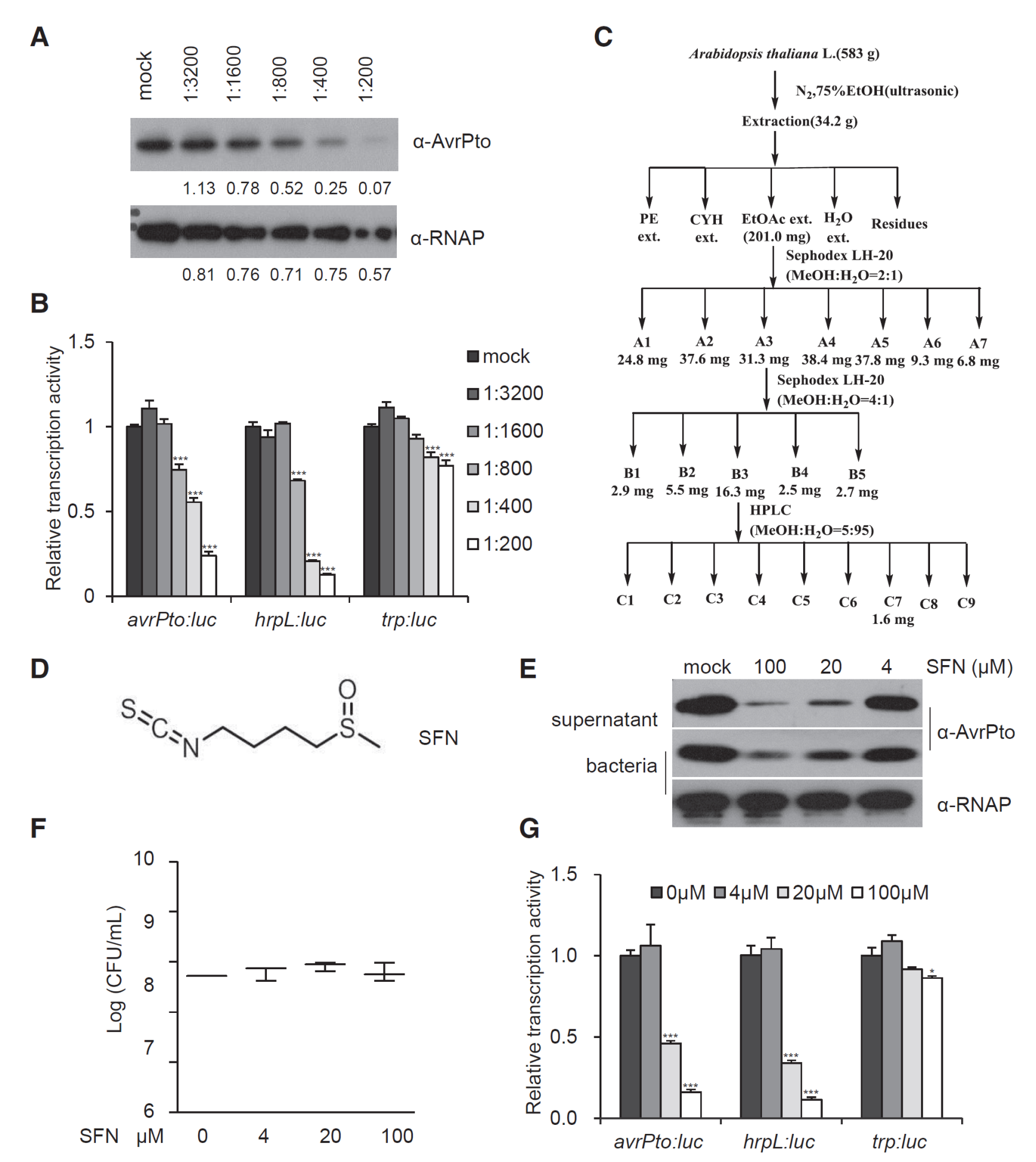 图二:通过生物活性导向的天然产物分离鉴定出Sulforaphane(SFN)可以抑制病原菌三型分泌系统
