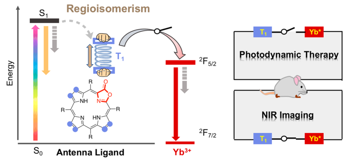 该研究利用卟啉的芳香性调控激发态的区域异构效应,通过β位[3+2]环加成反应,合成了结构相似,但三线态能级有较大差异的卟吩二酯异构体,成功地改变对稀土(镱)的传能途径,有效调控了顺/反式稀土配合物的电子结构与光物理性质。在随后的细胞与小鼠实验中,作者展示了顺式异构体的近红外成像能力和反式异构体的光动力治疗功能,并在活体(小鼠)进行了诊疗一体化的概念性验证。该研究工作首次将“区域异构效应”这一精准调控分子(金属)电子结构和激发态的手段应用于稀土化学生物学,为稀土“异构赋能”分子的设计和应用提供新思路。