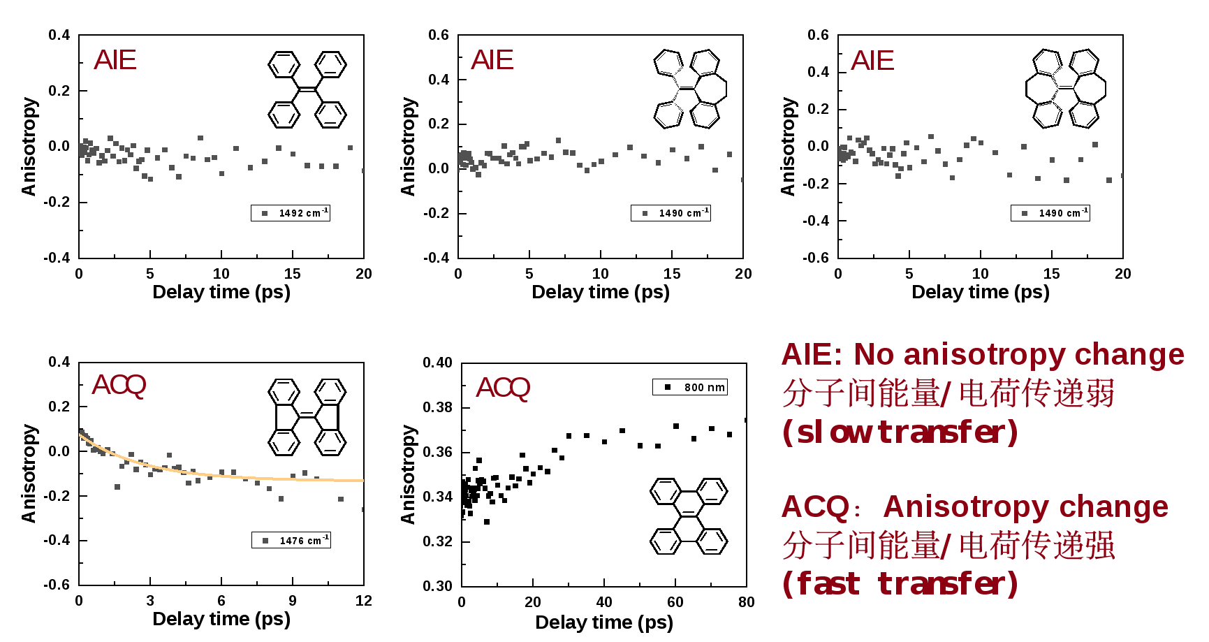 图2. AIE和ACQ分子的各向异性(跃迁偶极矩夹角)随时间的变化关系。