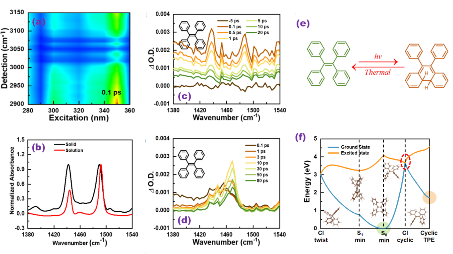 图1. (a) TPE的2D 紫外/红外光谱图。(b)TPE固体和溶液的FTIR光谱。(c)TPE固体电子激发后的红外响应,峰形与FTIR类似。(d)TPE液体电子激发后的红外响应,新峰产生,意味着产生了新结构。(e)TPE异构成不稳定的环状中间体。(f)TPE势能图。绿点是电子基态最稳定结构,黄点是环状中间体,虚线圈内的交叉点是形成环状中间体必经的CI。