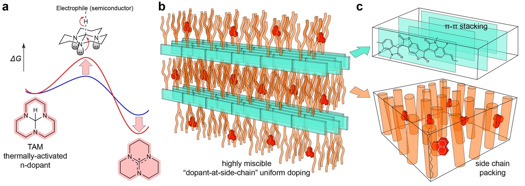 图1 a) TAM掺杂剂以及热激活掺杂的势能面示意图。b) TAM掺杂聚合物半导体的分子堆积示意图。c) TAM掺杂聚合物半导体的π-π堆积和烷基链堆积示意图。