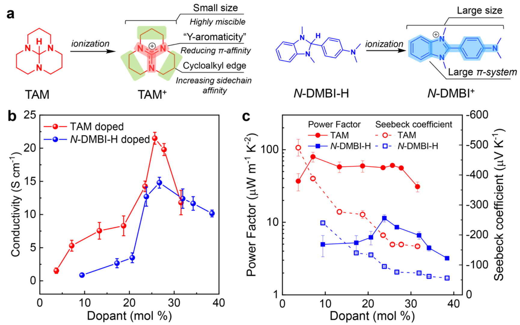 近期,3003新葡官方网站裴坚教授课题组采用计算机辅助的筛选方法,设计了一种具有热激活掺杂能力和高混溶性的n型掺杂剂TAM,实现了对有机半导体高效、均一、稳定的n型掺杂。为了兼顾n掺杂剂的高稳定性和强掺杂能力,裴坚课题组通过对反应热力学和动力学的研究设计了强热力学活性、弱动力学活性的热激活掺杂方法。为了实现与有机半导体的高混溶性,裴坚课题组通过对色散力的研究设计了与有机半导体侧链的极化率高度一致、掺杂之后对离子分布于半导体侧链区域的n掺杂剂。在本工作中,他们实现了从薄膜状态到体相的目前溶液加工n型半导体中的最高电导率21 S cm-1和高达51 μWm−1 K−2的热电功率因子,并展示了首例溶液加工的柔性全聚合物热电发电机。