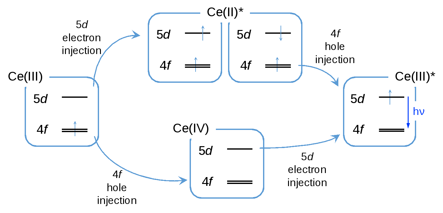 作者认为,器件中的配合物可以通过具有单电子的铈(III)离子直接俘获电子和空穴,形成二重态激子并辐射发光(图2),从而绕过传统闭壳层发光材料中自旋统计限制,实现高激子利用率的目标,而自旋和宇称允许的d-f跃迁所伴随的短激发态寿命则是器件稳定性提高的根源。