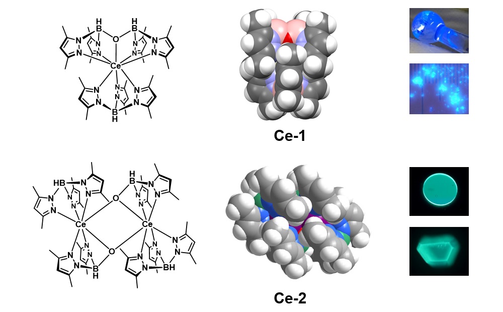 图1. 配合物Ce-1、Ce-2的分子结构和发光颜色