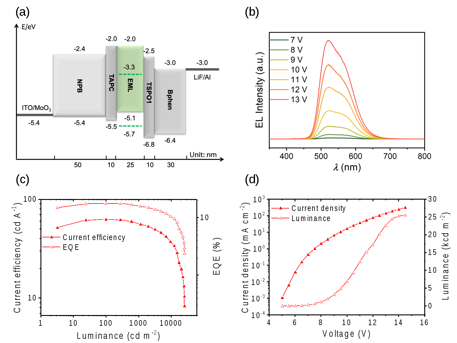 图2. 基于Eu(II)配合物的OLED器件结构示意图和性能曲线