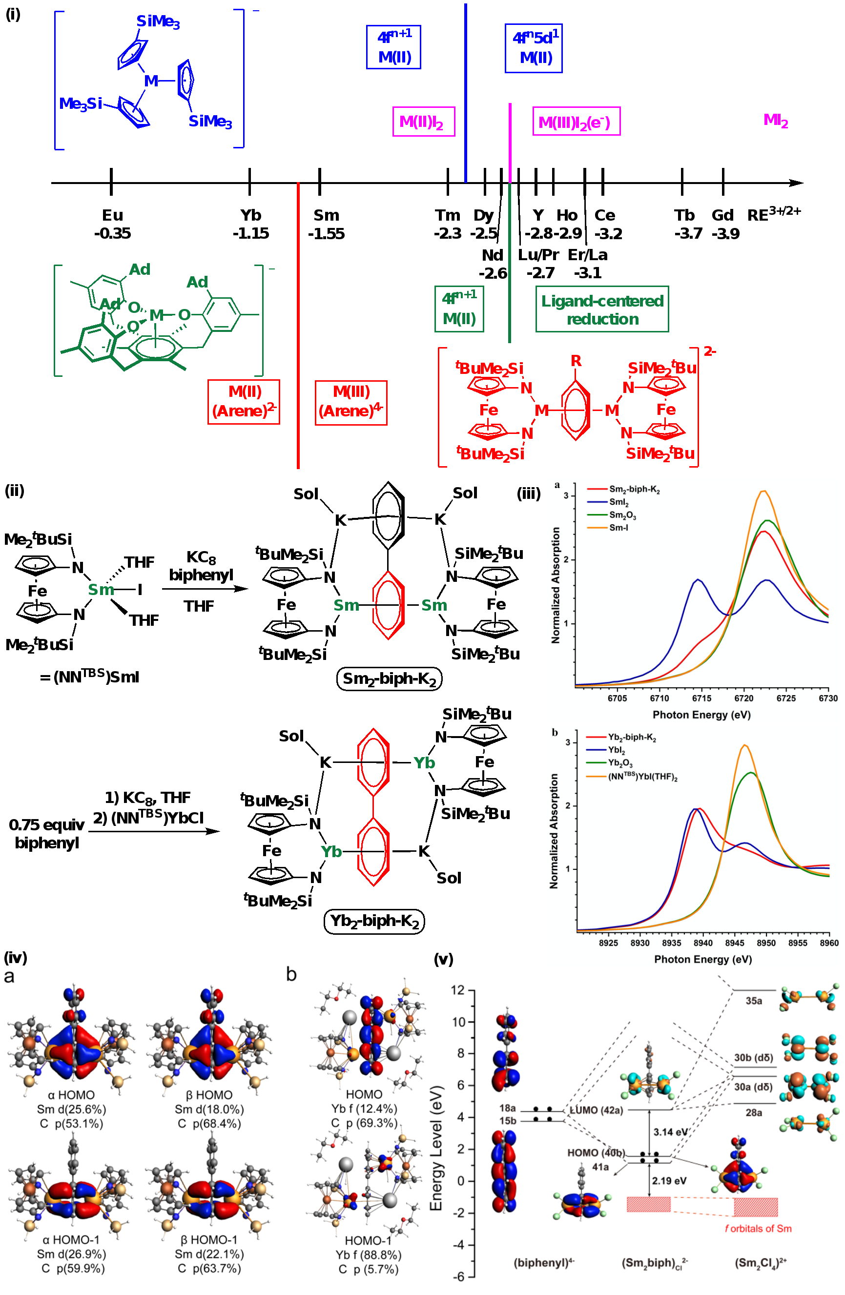 钐和镱的联苯配合物可以通过用石墨钾还原钐或镱的三价前驱体与联苯的混合溶液来合成(图1(ii))。对还原产物的单晶X射线结构表征显示,两个钐离子配位在同一个苯环的两侧,而两个镱离子则配位在不同苯环的两侧。反应性、吸收光谱、X射线吸收近边结构(图1(iii))和磁学表征均表明,钐为+3价的4f5构型,联苯为-4价;而镱为+2价的4f14构型,联苯为-2价。