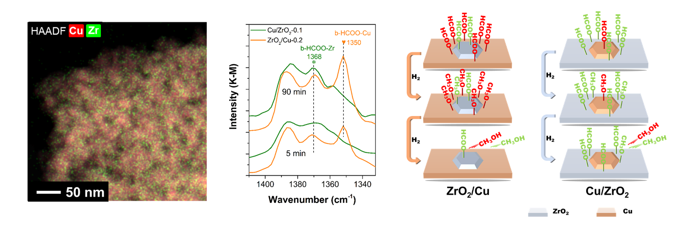马丁课题组最近与布鲁克黑文国家实验室Rodriguez博士和山西煤化所温晓东教授等课题组合作,提出了实验合成反相催化剂,构建全新ZrO2-Cu反相界面,促进CO2加氢制甲醇的研究思路。研究者采用共沉淀法,成功制备了CuO 粒子负载1-2 nm无定型ZrO2 氧化物纳米粒子的反相ZrO2/CuO催化剂。性能评价表明10%ZrO2/Cu 反相催化剂在220ºC 低温下甲醇的时空收率高达524 gMeOH kgcat-1 h-1,较传统10%Cu/ZrO2 催化剂提升3倍以上(159 gMeOH kgcat-1 h-1)。近常压XPS 研究揭示了纳米级分散的ZrO2粒子较普通氧化锆载体更易被部分还原形成ZrO2-x,该结构有利于CO2 分子的活化;同时原位漫反射红外表征结果(in-situ DRIFTs)表明在反相ZrO2-Cu 界面上形成了大量全新的HCOO*-Cu 中间物种;加氢动力学研究发现该中间物种较传统催化剂上生成的HCOO*-Zr 活性物种加氢速率显著提升,并且反相催化剂的界面也更有利于后续表面含氧中间物种的进一步加氢和脱附。纳米级分散ZrO2 结构对CO2的高效活化及反相界面活性位上甲酸根中间物种的更易加氢转化是反相催化剂ZrO2/Cu低温催化性能显著提升的根本原因。