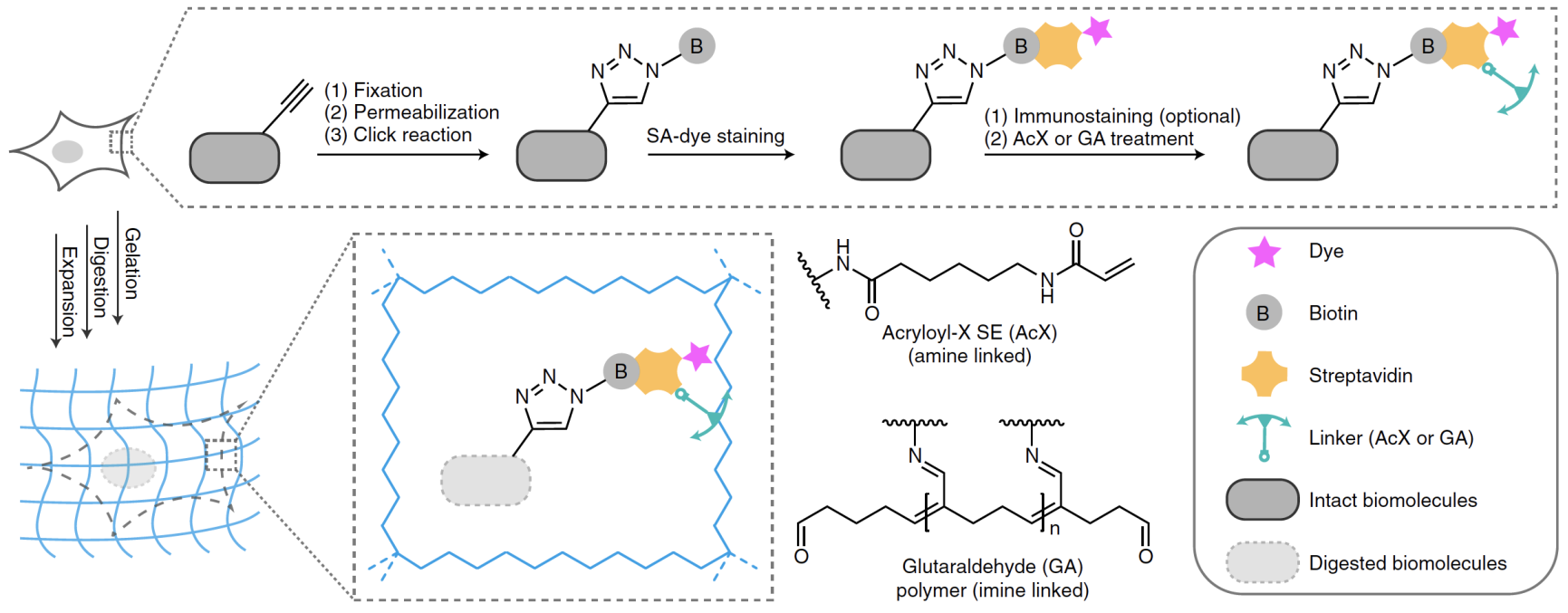 膨胀显微成像技术(Expansion microscopy,ExM)则从样品制备入手,绕过了光学衍射极限,实现了让超分辨荧光成像“飞入寻常百姓家”。整个流程中首先将丙烯酸盐充满整个生物样品内部,并使其聚合形成凝胶。凝胶吸水膨胀后,原本临近的生物分子被拉远,但相对位置保持不变。因此利用常规的荧光显微镜对膨胀后的样品进行成像,同样可实现超分辨的成像效果。然而目前的ExM技术缺乏一种普适性的在凝胶中锚定生物分子的策略,因此其应用范围局限于蛋白质、核酸,无法对脂质、聚糖以及小分子等生物分子进行成像。
