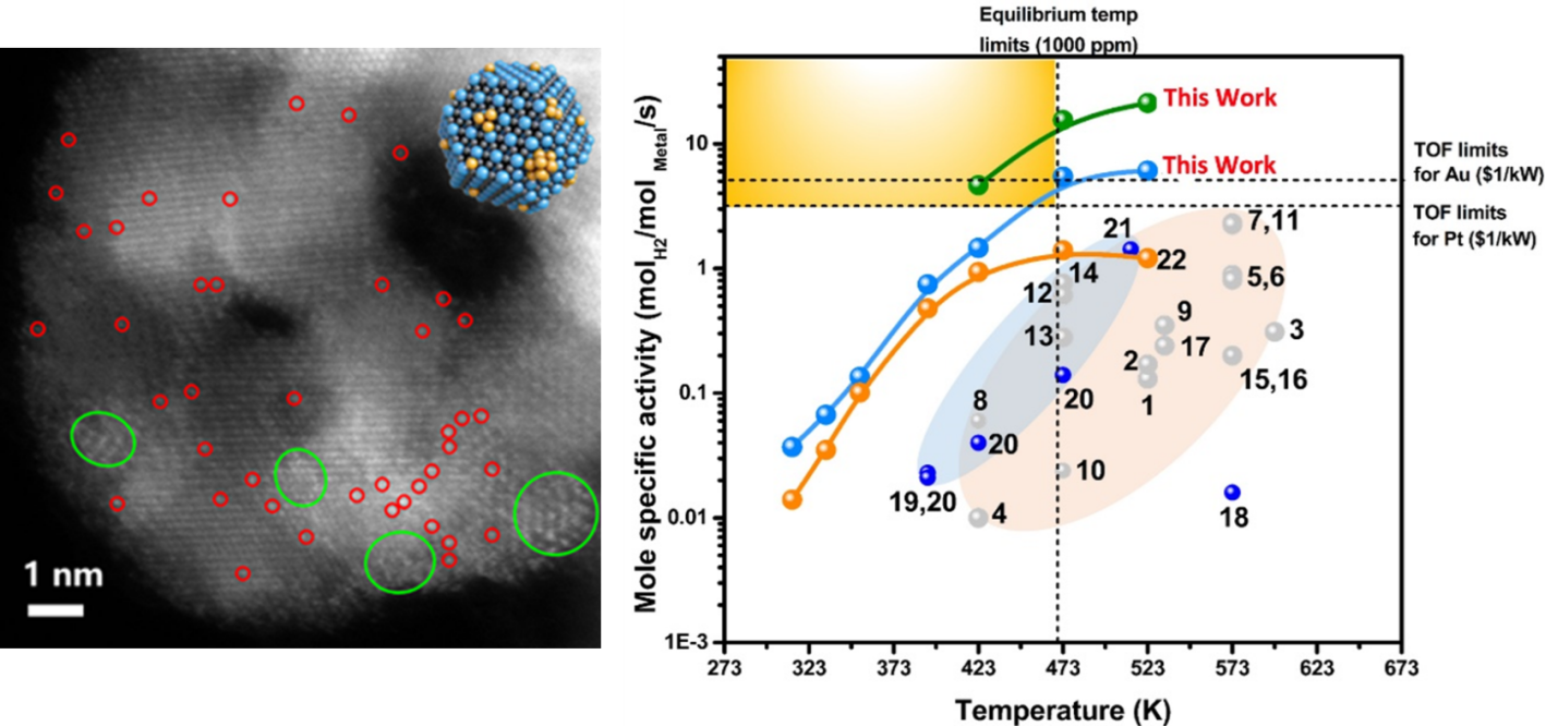 近日,该研究团队再次在《自然》(Nature)杂志发表论文,报道了一种高密度、高分散的原子级Pt物种(单位点Pt1物种以及亚纳米Ptn团簇)和α-MoC组成的界面催化结构用于高效催化水和CO活化。此催化剂在近室温至400˚C的超宽温度区间实现高效水煤气变换制氢,突破了现有催化剂工作温度区间较高且窄的局限,并且大幅度提升了α-MoC负载的WGS催化剂的反应活性及长效稳定性。以贵金属铂的价格为$6,242进行经济衡算,所报道的Pt/α-MoC催化剂首次突破了依据美国能源部2004年车载燃料电池发展规划所推算的催化活性限值(如图1所示)。该研究工作为氢能经济的推广提供了新的技术选择,也为研究者设计高活性、高稳定性的金属催化剂提供了一种新的思路。
