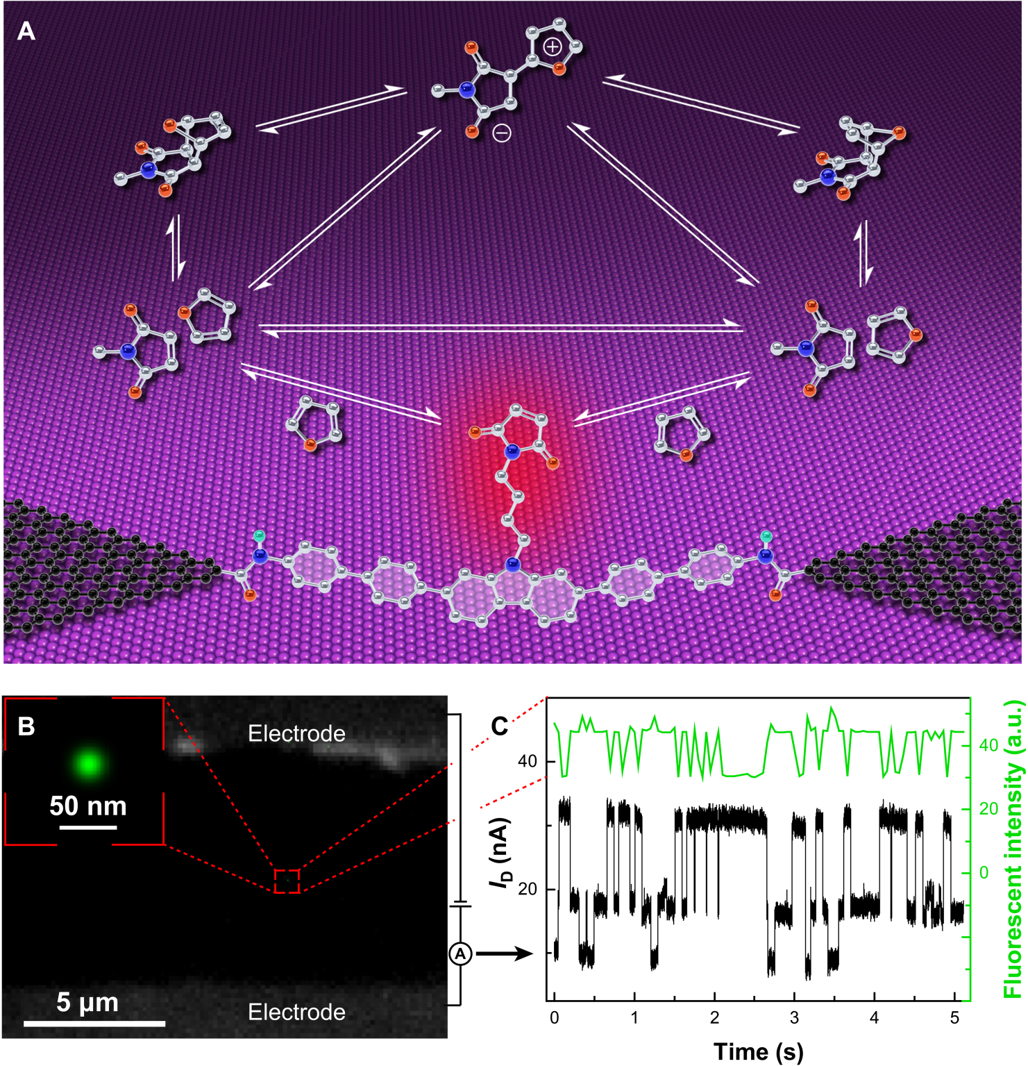“分步”和“协同”是我们对于多步骤化学反应的分类,然而这两者在动力学上并没有绝对的分界。超出时间分辨率的多步反应通常会被简化为“协同”过程,而对于中间体的检出则成为判定“分步”过程的依据。对于经典的Diels-Alder加成反应,在教科书里其一步周环的协同反应过程已经广为人知。而该机理并非绝对,传统的方法难以检测到快速痕量的反应轨迹。而且,对分步与协同路径的有效调控存在巨大挑战。最近,3003新葡官方网站郭雪峰课题组、中科院化学研究所张德清课题组以及加利福尼亚大学洛杉矶分校Kendall N. Houk课题组合作发展了一种基于单分子器件平台的单分子电学检测及调控新方法和新技术,获得了证明单分子器件的明确实验证据,实现了在单分子水平上对于分步Diels-Alder反应动力学的研究与调控(图1)。