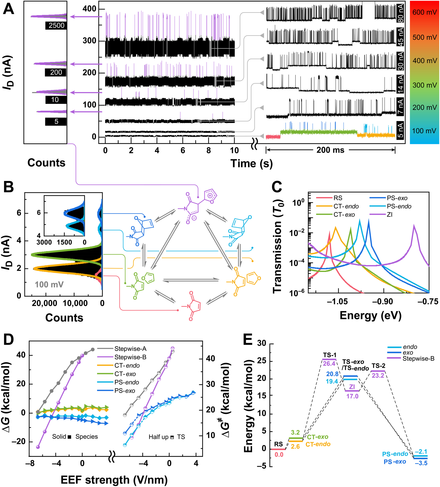 最近,他们进一步和合作者设计合成了以马来酰亚胺为功能中心的共轭分子,并在末端修饰上氨基,通过酰胺键将其连接在带有羰基官能团的石墨烯点电极之间,构建了稳定的单分子器件。通过自主研发的超高时空分辨率光电一体化检测系统,以电学与光学双模式的方法对单分子器件进行联合表征,首次提供了单分子器件成功构建的直接实验证据(图2)。由于电学监测有较高的时间分辨率,能够揭示电导与分子结构之间密切的构效关系,因此在化学反应进行的过程中通过实时、快速检测分子的电导变化可以实现分子在化学反应中结构变化以及所经过的反应路径的可视化。他们首先证明了公认的协同反应机制,并捕获到了在生成endo或exo构型的产物前会经过相应的关键中间体——电荷转移复合盐;然后通过单分子电学检测平台对精确时间轨迹和详细反应路径的记录,他们揭示了第二种分步(经过两性离子中间体)的加成反应新机制;最后通过偏压和温度,他们实现了对协同和分步Diels-Alder加成反应路径的调控(图3)。他们对这些结果进行仔细论证,结合实验和理论揭示了一种电场催化的Diels-Alder加成反应新机理:可施加较强的电场(~109 V/m),这使得分步反应中的关键中间体——仅加成一根键的两性离子中间体——的势能下降,大大增强了其稳定性(图3)。这种电场催化效应使得他们发现了系综实验上从未观测到的分步反应路径,突破了书本上人们的传统认知。他们也对这几种过程的热力学与动力学进行了细致的分析,从而建立了一种通过电场对中间体寿命以及化学反应路径调控的新方法。