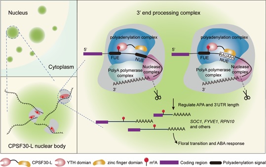 与拟南芥开花以及ABA响应的三个基因SOC1, RPN10及FYVE1的转录本可以被m6A修饰且被CPSF30-L结合。相对于野生型而言,在cpsf30-l中,SOC1, RPN10及FYVE1的pre-mRNA在3’UTR加工过程中更倾向于远端poly(A)位点,导致3’UTR加长易被降解,相应mRNA表达量下降,继而导致cpsf30-l突变体中呈现出晚花以及ABA响应敏感的表型(图一)。这项研究发现了植物中m6A的全新功能—调控植物pre-mRNA聚腺苷酸化和植物相分离的分子机制。
