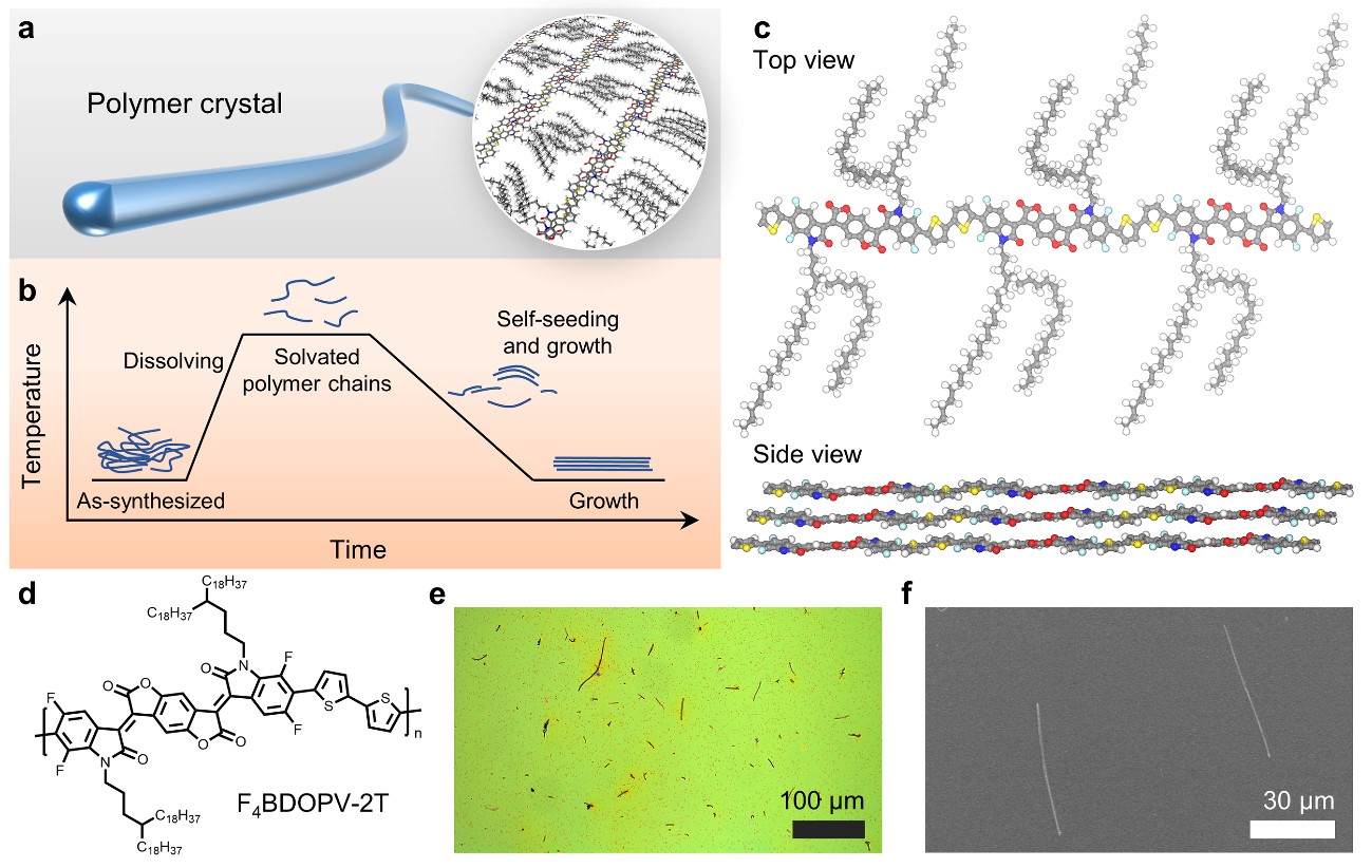 图1. 共轭高分子F4BDOPV-2T的晶体与晶体结构。a)微米线晶体示意图;b)晶体生长过程示意图;c)晶体堆积结构;d)化学结构;e,f)微米线晶体的光学显微镜图片与电子显微镜图片。