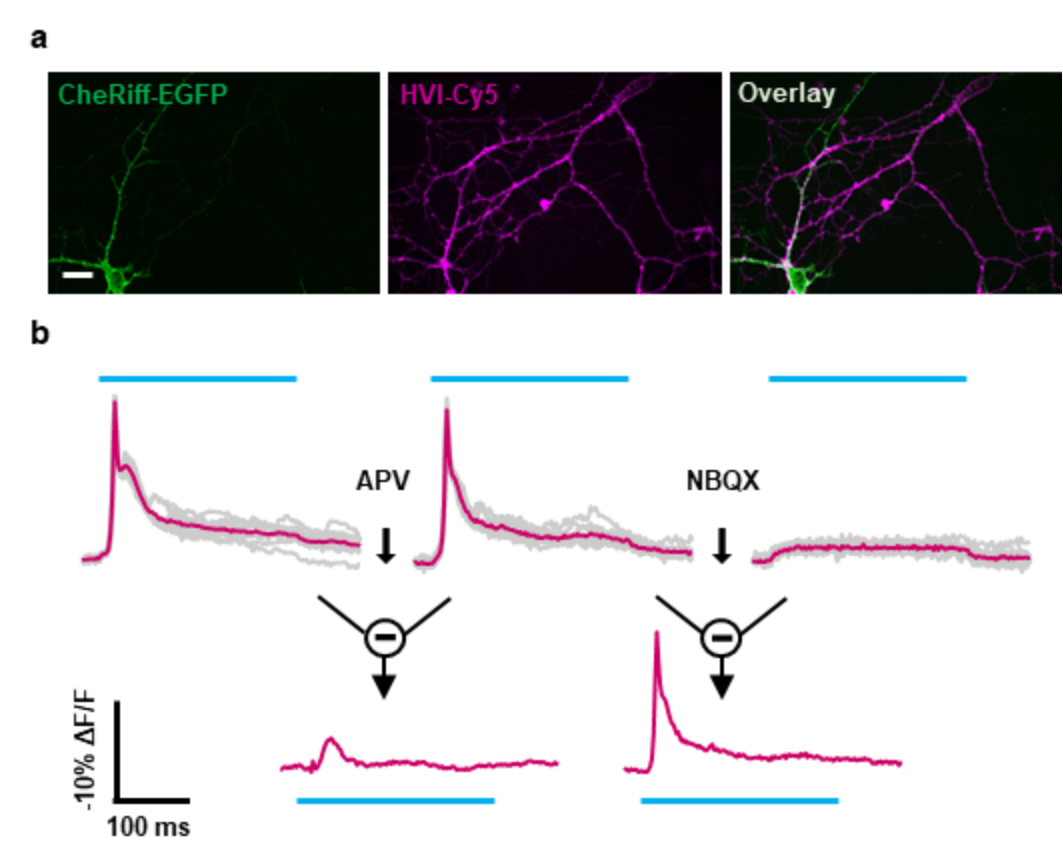 此外,实验将HVI-Cy5与光遗传学工具分别表达在不同的大鼠海马体神经元中,利用膜电位成像评估APV和NBQX两种药物对神经元突触连接的影响,解析了NMDAR和AMPAR两类谷氨酸受体对突触信号传递的贡献(图4)。未来,HVI-Cy5有望用于在体外筛选作用于受体蛋白的激动剂或拮抗剂。
