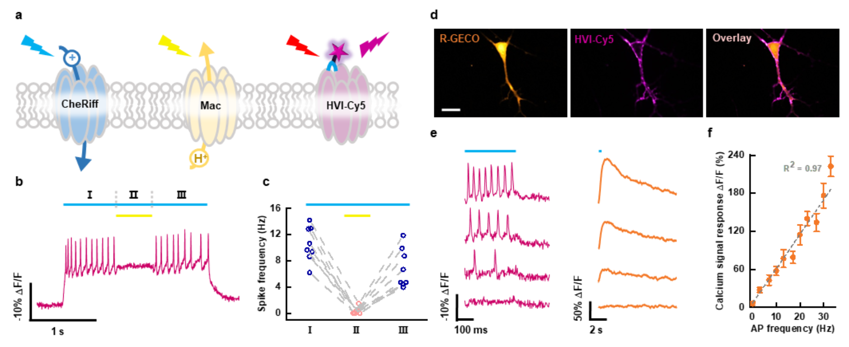 实验表明,HVI-Cy5可与光遗传学工具联用(图3)。研究人员用短波长光单向或者双向调控神经元兴奋性,同时在远红区荧光通道记录膜电位变化,扩充了全光学电生理学工具箱(图3a-c)。该技术相比于传统的多电极膜片钳刺激并记录,技术难度明显下降。HVI-Cy5还可以与其他荧光探针进行双色成像,无串扰监测细胞膜电势及钙离子、递质和pH等生理信号(图3d-f)。多色成像将帮助研究者更好地了解膜电位与其他生理信号动态变化的联系和差异。
