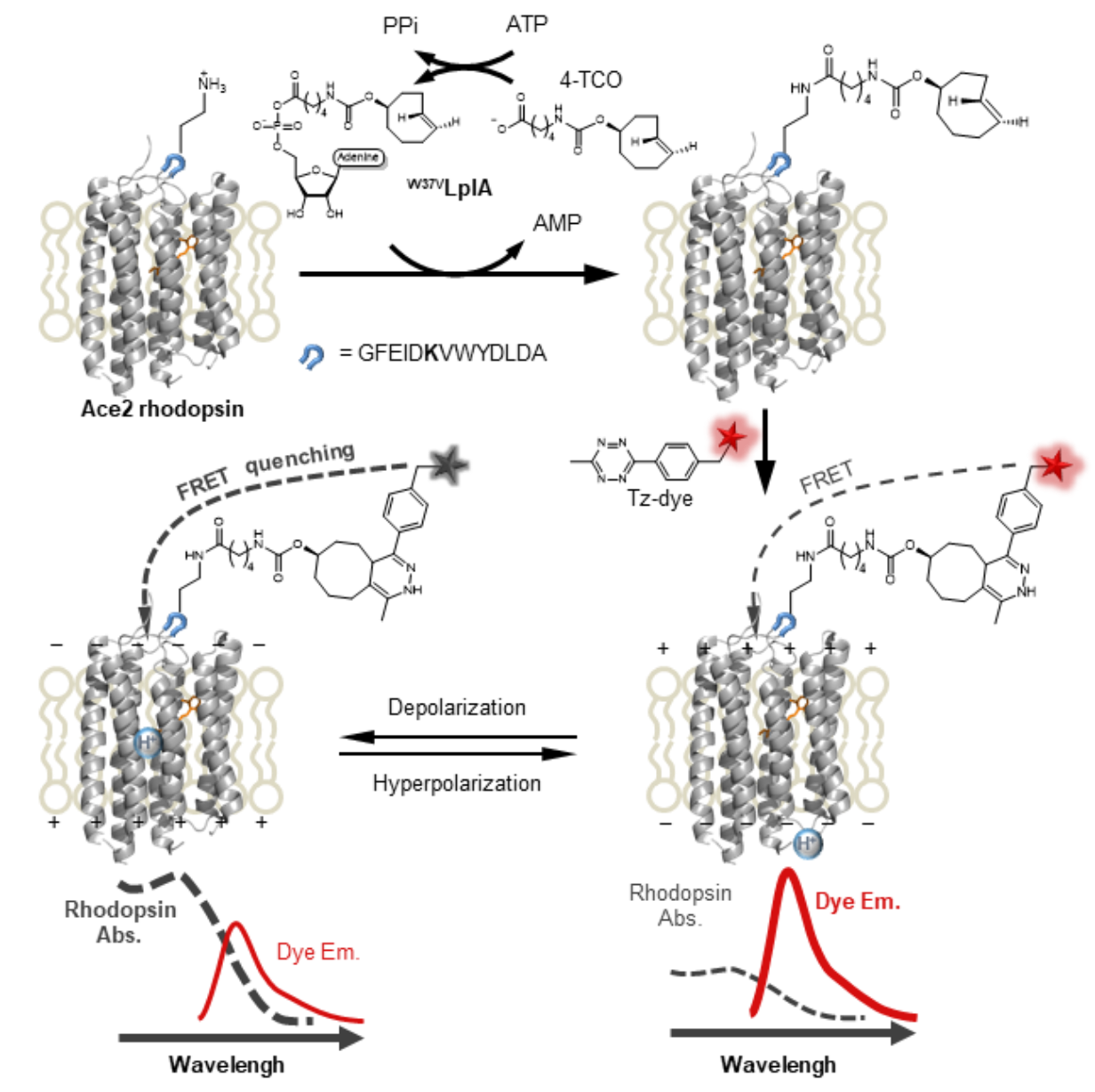 邹鹏课题组长期致力于发展和应用化学探针技术,研究参与神经信号转导过程的生物大分子、支配神经活动的化学和物理信号。他们率先提出“复合型膜电位探针”的概念,利用化学手段将荧光染料与视紫红质蛋白相偶联,利用后者的电致变色效应实现膜电位成像(Angew. Chem. Int. Ed. 2018, 57, 3949-3953)。陈鹏课题组长期致力于发展适用于活细胞及活体动物的生物正交反应,并通过遗传编码技术,实现了蛋白质的特异标记、激活与调控(Nat. Chem. Biol. 2016, 12, 129-137)。在最新的研究成果中,两个课题组合作,将化学反应策略与蛋白质骨架改造相结合,对神经元的膜蛋白进行了原位的“生物正交”工程优化。一方面,鉴于目前大多数生物正交反应难以高效地标记膜蛋白,以及点击化学反应(铜催化炔基-叠氮环加成反应)对神经元的毒性,他们改用了生物相容性更好、效率更高的逆电子需求狄尔斯-阿尔德反应(IEDDA),将高荧光量子产率的远红区染料引入工程改造的视紫红质蛋白的特异位点。另一方面,他们针对视紫红质蛋白Ace2中的关键质子受体氨基酸残基进行突变筛选,最终得到了消除稳态光电流且亮度及灵敏度显著提升的远红区复合型探针HVI-Cy5。当神经元膜电势发生去极化时,质子电化学势的改变促进视黄醛席夫碱的质子化,从而改变视紫红质的吸收光谱,最终通过FRET效应影响其偶联荧光染料的量子产率,导致荧光信号变化(图2)。