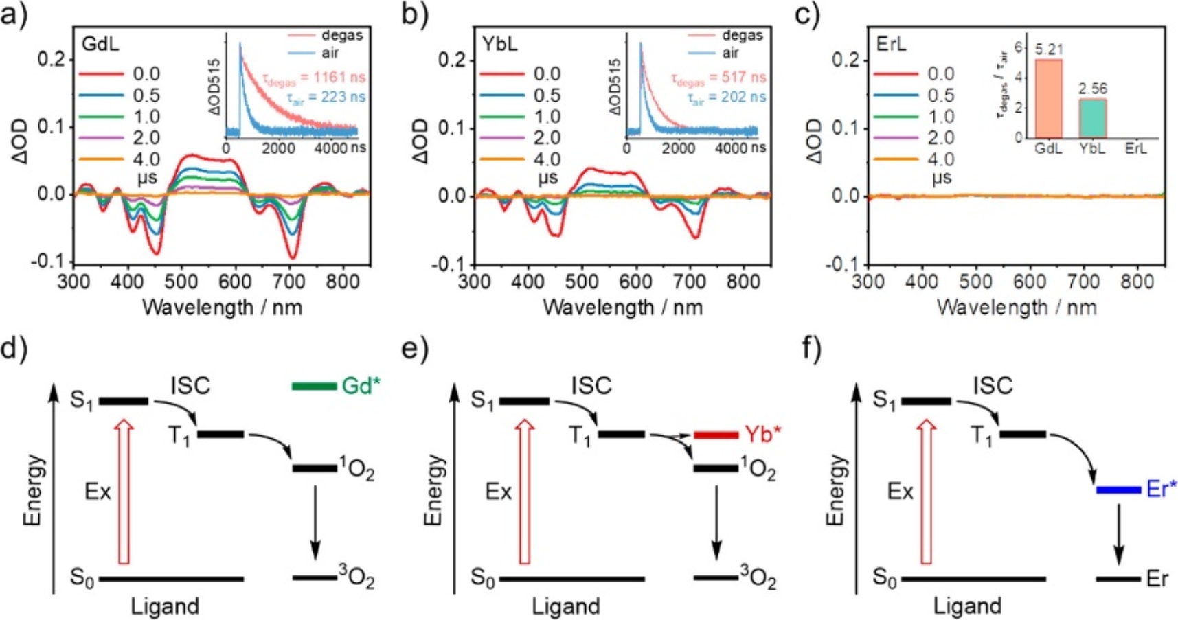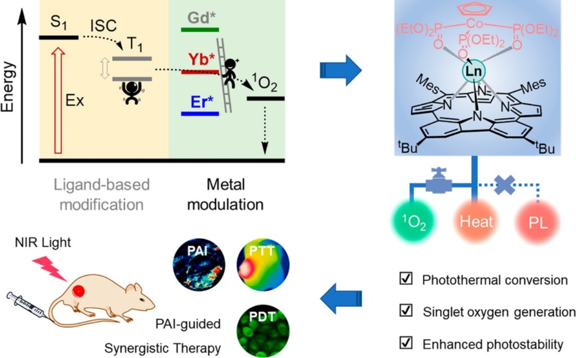 基于近红外吸收的咔唑卟啉配体,合成了一系列具有不同稀土金属中心(Ln = Gd,Yb,Er)的配合物。这些配合物在650-850 nm的光疗窗口有着较强的吸收,通过吸收、发射以及瞬态吸收光谱,并结合理论计算,揭示了Ln配合物在光激发下的能量耗散途径高度依赖于配体三重态和Ln离子激发态之间的能隙 (图2)。其中,Yb配合物在产生单线态氧、放热及发光等能量耗散途径之间表现出了良好的平衡,同时实现光声成像、光热治疗、光动力治疗等功能。