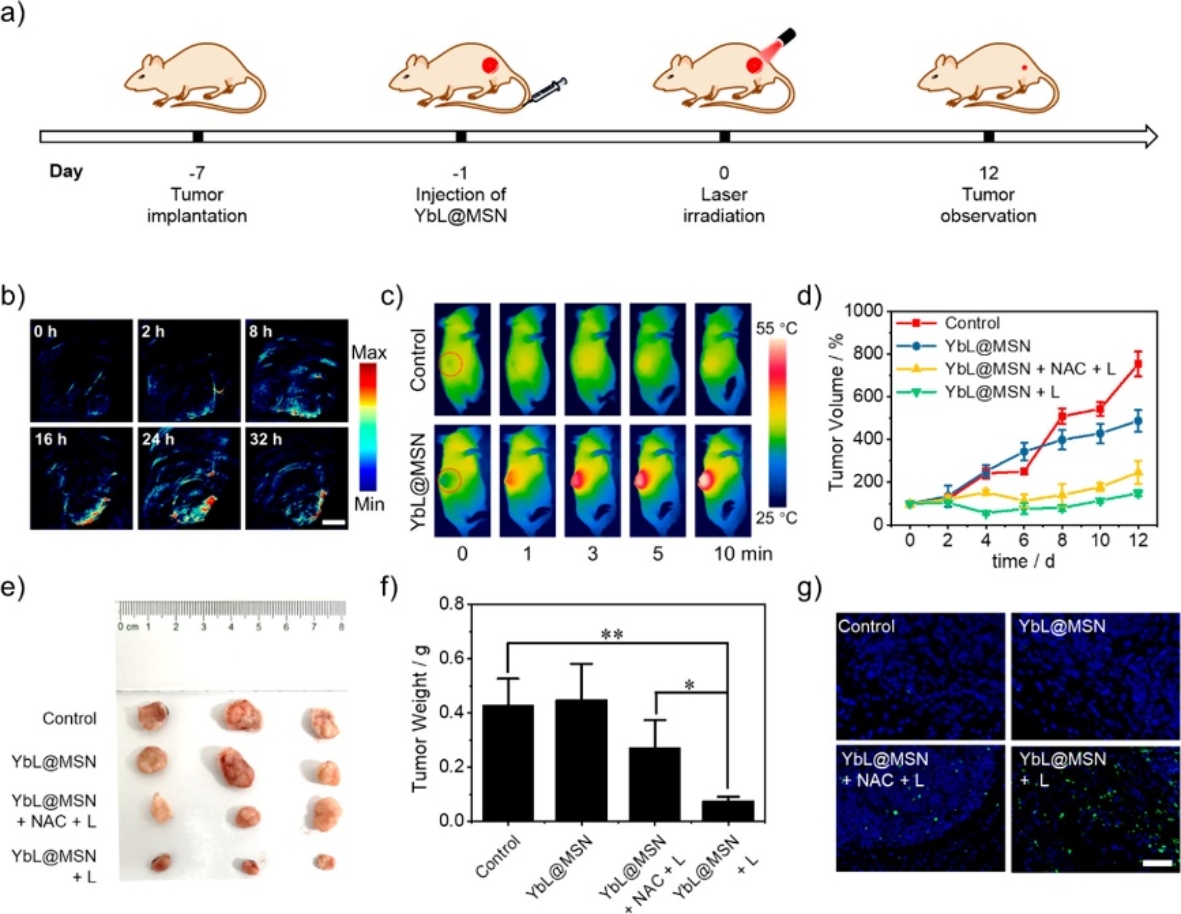 通过将Yb配合物负载到介孔二氧化硅纳米颗粒中,得到了具有水溶性以及生物相容性的YbL@MSN,并显示出较高的光热转化效率 (η = 45%)以及良好的单线态氧量子产率 (ΦΔ = 31%)。此外,小鼠肿瘤模型研究表明YbL@MSN可在活体内实现光声成像引导下的光热/光动力协同治疗,在单次近红外激光照射后能够明显抑制肿瘤的生长 (图3)。