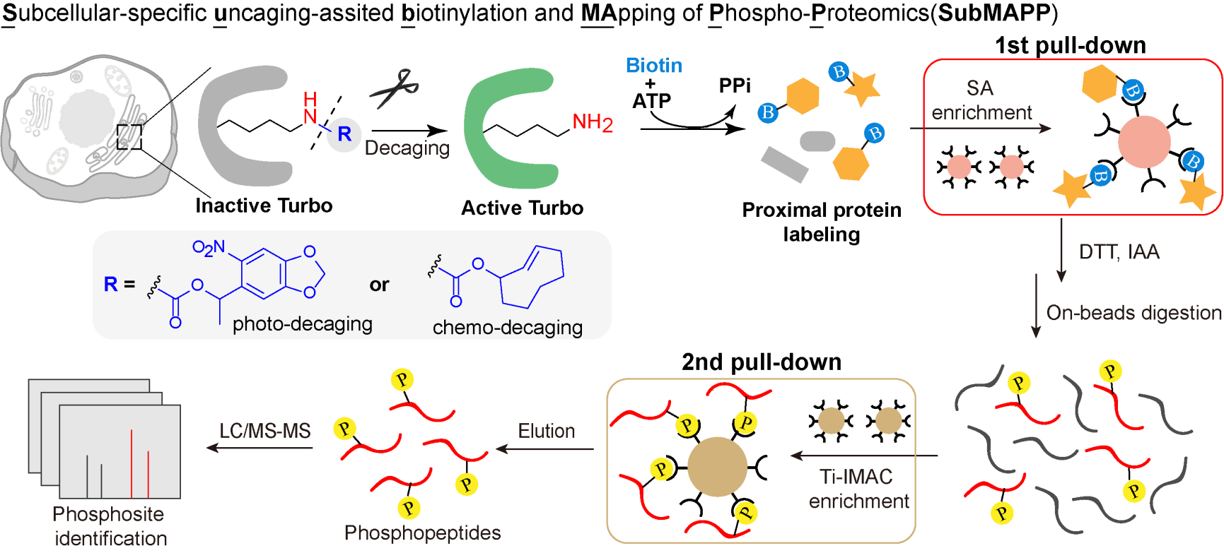 近日,3003新葡官方网站陈鹏课题组与邹鹏课题组在PNAS上合作发表题为“Spatiotemporally resolved subcellular phosphoproteomics”的论文,利用生物正交剪切反应和化学脱笼策略,构建了可控激活的邻近标记酶,并进一步与磷酸化富集技术相偶联,开发了首个基于生物正交邻近标记的亚细胞磷酸化蛋白质组捕获技术——SubMAPP(Subcellular-specific uncaging-assisted biotinylation and MApping of PhosphoProteome),成功实现了活细胞中亚微米分辨率下的磷酸化蛋白质组捕获,并将其拓展至神经元及活体动物等复杂体系。