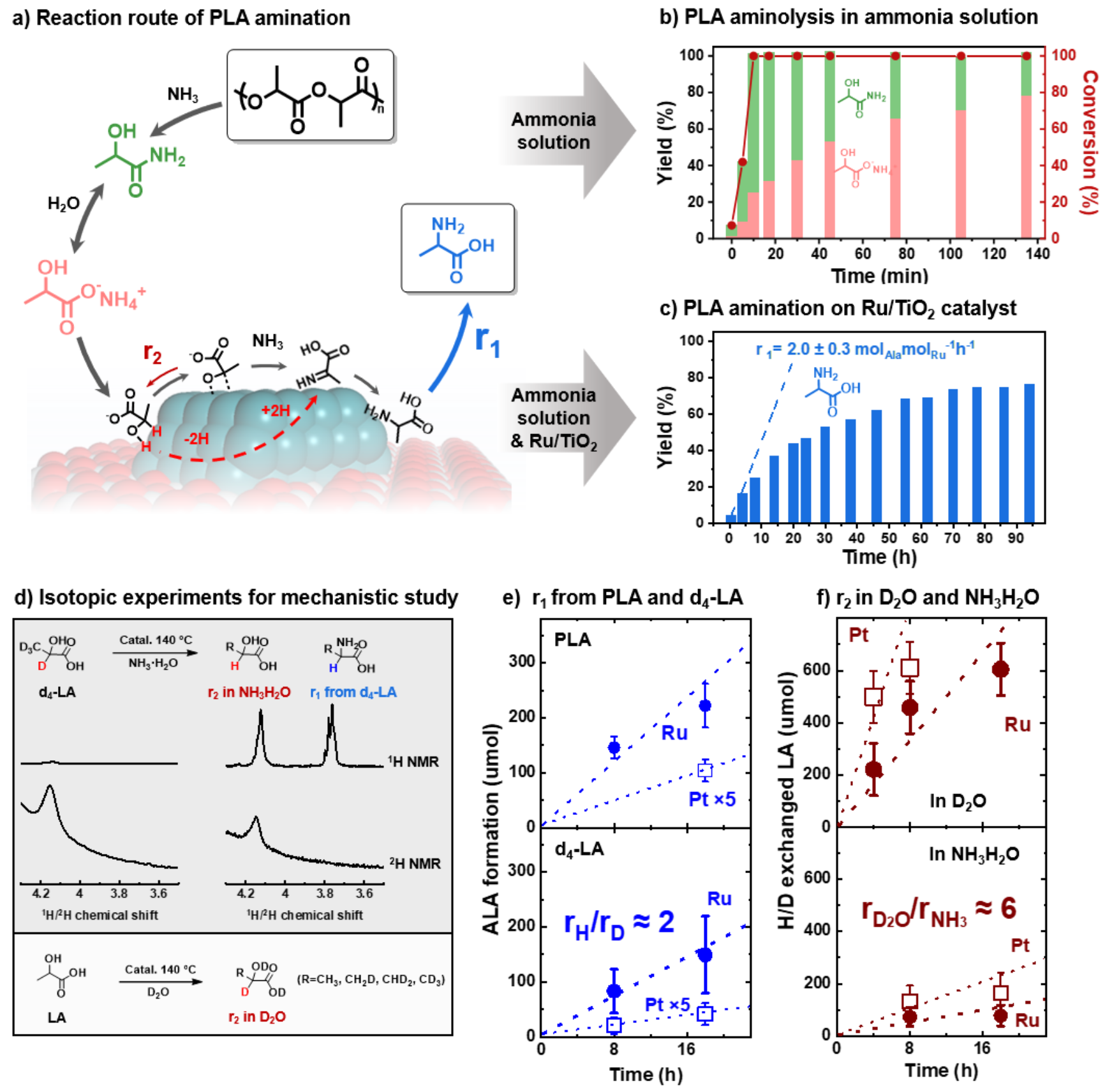近日,3003新葡官方网站马丁/王蒙课题组在国际上首次报道了一种将聚乳酸塑料催化转化为丙氨酸的新过程 (图1)。采用Ru/TiO2催化剂,在无外加氢气的条件下,氨水简单加热处理即可实现聚乳酸塑料高效制备丙氨酸(77%收率, 反应温度140度)。研究表明,PLA在氨水中首先氨解形成乳酰胺,接着乳酰胺水解生成乳酸铵,乳酸铵再进一步在催化剂表面胺化形成丙氨酸 (图2a)。同位素示踪实验表明,乳酸铵α-H的活化是反应的重要步骤,且反应遵循脱氢-胺化-再加氢路线 (图2d)。而金属催化剂对于α-H的活化、后续胺化均起到了关键作用。通过分离-循环可以进一步提高丙氨酸的产率,丙氨酸总体选择性可达94%,纯度超过95%。使用商业PLA吸管(约含 83% PLA)评估了这种PLA到丙氨酸过程的效率,5.0 g PLA吸管经过催化转化可获得3.0 g的纯品丙氨酸,并且全过程仅需添加氨水加热即可实现聚乳酸转化,无需外加氢气。