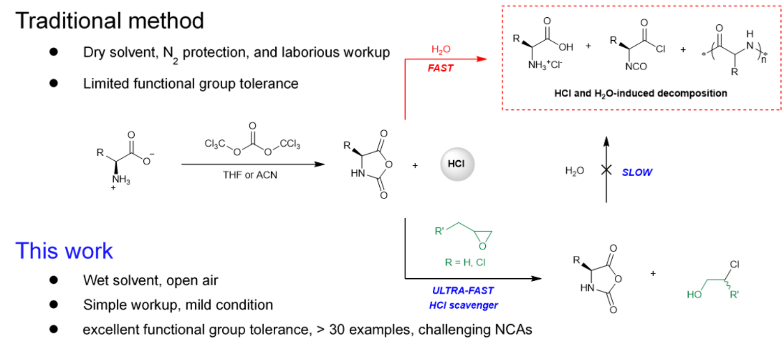 聚氨基酸是一种以氨基酸为重复单元的通过肽键连接的高分子材料,可用于异相催化、组织工程、表面活性剂、药物递送和自组装等领域。聚氨基酸具有天然的生物相容性与可降解性,有着广泛的生物医药前景。氨基酸衍生的氮羧基内酸酐(NCA)单体的开环聚合被广泛认为是制备公斤级(以上)及高分子量聚氨基酸的最为有效的方法之一,但NCA制备条件的严苛严重阻碍了聚氨基酸的规模化合成,也让众多学术小组对其敬而远之。具体而言,NCA合成的难点包括:对空气湿度敏感、反应条件剧烈、产生大量废酸、官能团兼容性差;合成和提纯都需无水溶剂,大部分操作都需要在手套箱或氮气保护下进行,这导致造价昂贵并带来操作的极大不便。