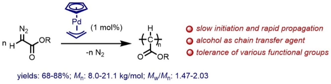 除了在有机合成中的应用外,钯卡宾的迁移插入也是卡宾C1聚合的关键步骤。C1 聚合可以得到主链由碳碳单键构成的聚合物,受到人们的关注。其中,重氮乙酸酯的C1聚合被广泛研究,它可以得到主链每个碳原子都被酯基取代的聚合物,这类聚合物通过传统的烯烃配位聚合无法合成。在近期的研究中,王剑波课题组发展了一种新的引发体系,(环戊二烯基)(烯丙基)钯[Cp(π-allyl)Pd],可以高效地实现重氮乙酸酯的链式聚合。该聚合体系可以兼容不同的烷基、芳基以及活泼官能团取代的单体,并且可以方便地实现聚合物的后修饰。