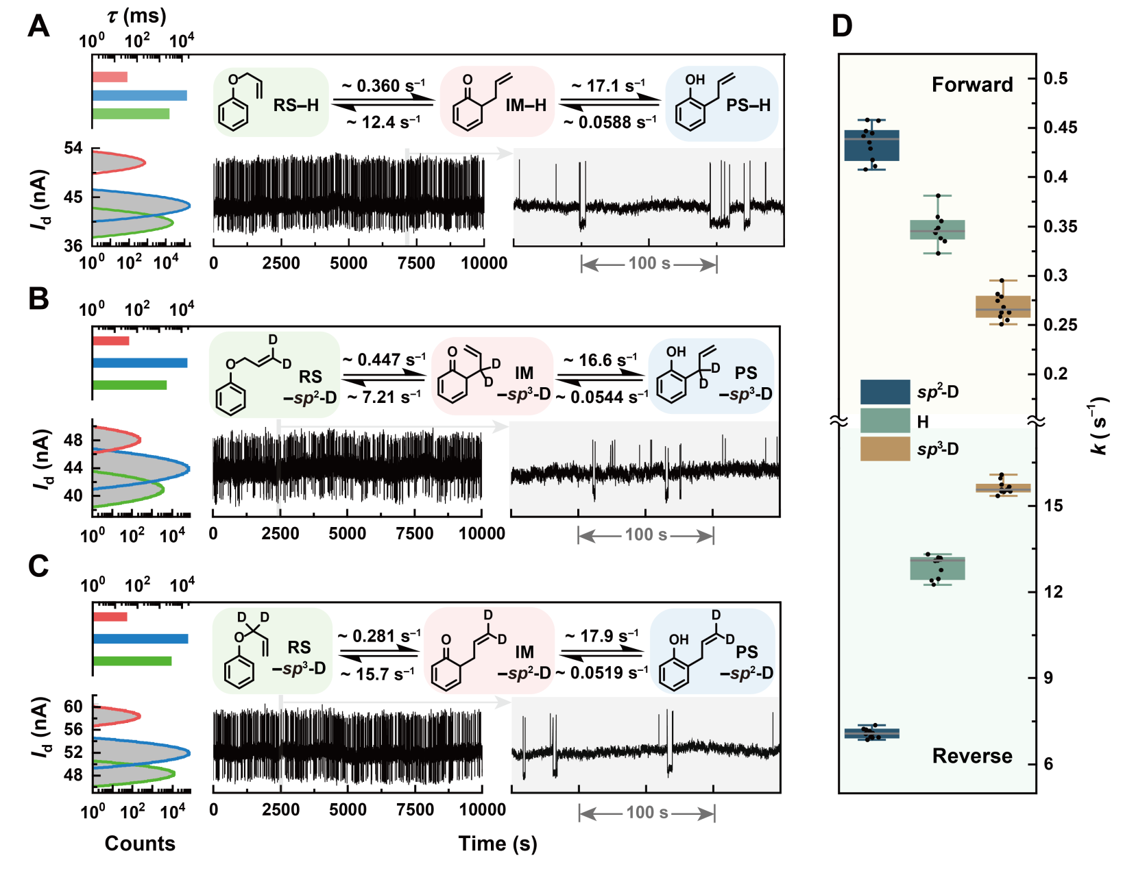 全面了解化学反应的内在机制对于优化合成路线,节约工业生产成本具有极其重要的作用。尤其是对决速步的深入理解,有助于我们提高反应产率和效率。动力学同位素效应 (KIE) 是宏观实验中确定反应决速步以及判断反应过程中过渡态成断键程度的一个重要工具。然而,由于受到天然同位素丰度低和反应程度的限制,导致KIE的测量灵敏度低、准确度差,因而要精准地测量反应KIE值(同位素参与的化学键不发生断裂的二级KIE尤其难测量)一直是一个难题。近日,3003新葡官方网站郭雪峰课题组、材料科学与工程学院莫凡洋课题组和合作者开发了一种基于单分子检测技术与KIE相结合的新方法——单分子反应动力学同位素效应(sm-KIE),以Claisen重排反应为例检测二级KIE效应。其巧妙避开了宏观KIE在同位素丰度以及反应程度方面的受限,能够准确、方便地获得复杂反应中每步基元反应的KIE值,有望实现KIE的研究技术的进一步发展,对分析过渡态的结构具有重要意义(图1)。