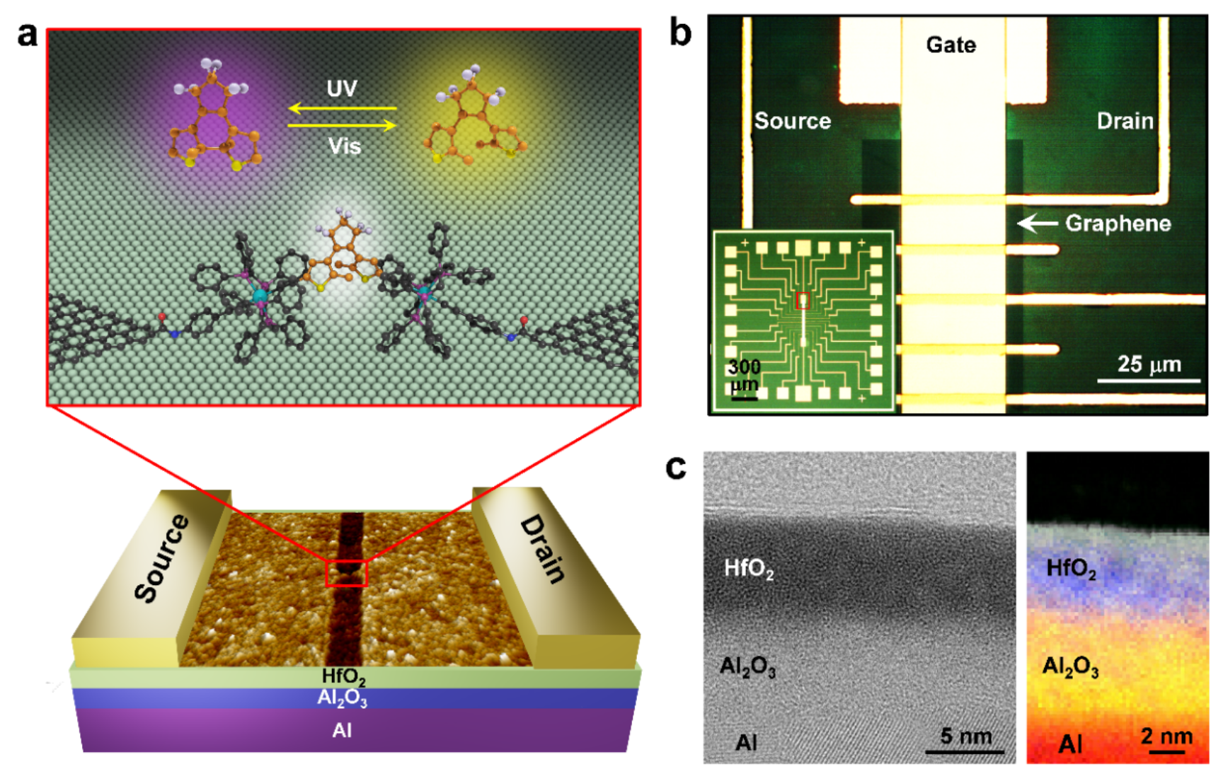 在前期工作中,郭雪峰课题组已经在单分子器件平台的基础上引入新型离子液体栅,研究了单分子对栅压的响应规律,构建了具有多种功能的单分子器件(Angew. Chem. Int. Ed. 2018, 57, 14026; J. Am. Chem. Soc. 2021, 143, 20811; Sci. Adv. 2022, in press)。此次他们开发了新的技术平台,在石墨烯基单分子器件的基础上首次引入了CMOS兼容的固态栅,结构上更接近传统的场效应晶体管。如图1所示,他们先沉积金属铝作为固态栅的栅极材料。金属铝表面自然氧化的氧化铝以及用溶胶凝胶法制备的氧化铪共同组成了超薄的介电层,总厚度约为10nm,一定程度上克服了短沟道效应。同时,氧化铝与氧化铪的组成避免了后续的工艺对介电层的破坏,抑制了栅极的漏电现象,在单分子水平上提高了场效应晶体管的性能。