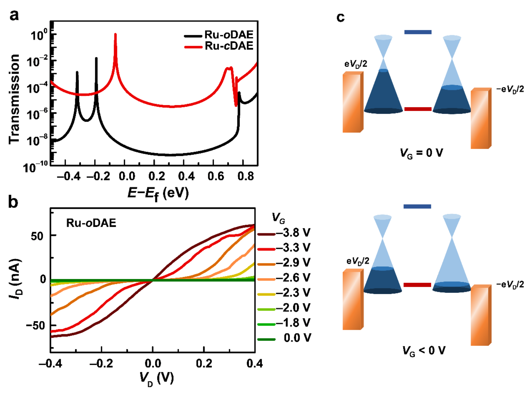 图 2. a.二芳烯分子开环(RU-oDAE)与关环(RU-cDAE)状态下的透射谱; b. 不同栅压下开环分子的ID-VD 特性曲线; c. 栅压下分子轨道能级的变化。