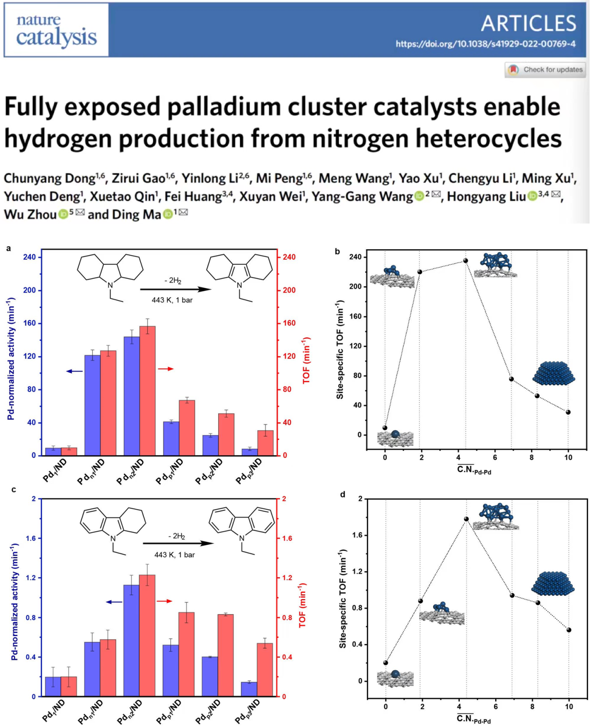 图1. 用于12H-N-乙基咔唑脱氢过程的Pd FECC,兼具超高金属利用率和理想的金属电子性质从而展示出优异活性(Nat. Catal. doi: 10.1038/s41929-022-00769-4)