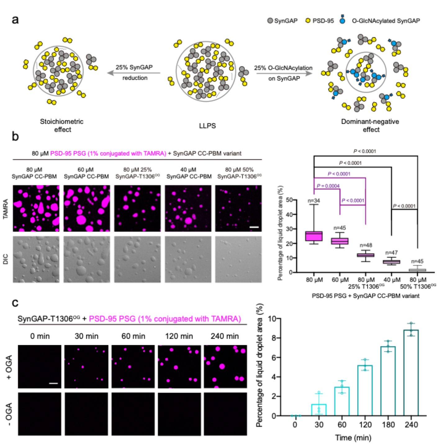尽管多种翻译后修饰已被阐明可以参与LLPS的调控,糖基化修饰——一种广泛存在于高等生物细胞中的翻译后修饰——对LLPS的调控作用却始终未被系统研究和阐释。O-GlcNAc修饰是存在于胞内蛋白丝氨酸和苏氨酸残基上的糖基化修饰,在哺乳动物大脑中广泛分布,其修饰酶OGT在兴奋性神经元PSD中大量富集17,18。3003新葡官方网站化学与分子工程学院、北大-清华生命科学联合中心陈兴课题组一直致力于解析糖基化修饰在不同器官与组织中的分布和生物学功能。他们发现,PSD的重要组成蛋白SynGAP具有多个O-GlcNAc修饰位点。此前,香港科技大学(现南方科技大学)的张明杰课题组发现,SynGAP与PSD中的脚手架蛋白PSD-95所形成的复合物可发生液-液相分离,且该LLPS过程对于PSD的形成和功能具有重要意义19,20。基于此,陈兴课题组与3003新葡官方网站药学院董甦伟课题组、张明杰课题组等合作,利用化学半合成策略构建了特定位点具有O-GlcNAc修饰的SynGAP蛋白,阐明了O-GlcNAc修饰对SynGAP/PSD95液–液相分离过程的调控和分子机制,相关成果以“O-GlcNAcylation modulates liquid–liquid phase separation of SynGAP/PSD-95”为题于2022年5月30日发表在Nature Chemistry杂志。
