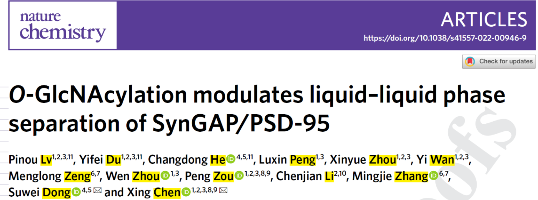 陈兴课题组长期致力于糖化学和糖生物学研究,神经系统中的蛋白质糖基鉴定与功能研究是目前的重点方向之一。本工作利用化学半合成策略与多种技术手段,详细阐明了特定位点O-GlcNAc修饰对SynGAP/PSD-95液–液相分离的调控作用,揭示了O-GlcNAc修饰在该体系中显性负调控的作用方式和抑制LLPS发生的分子机制,证明了OGT/OGA对该过程的动态调控。该发现为诠释O-GlcNAc修饰在调控神经系统发育与突触可塑性等过程中的重要功能提供一个新的机制。同时,O-GlcNAc修饰可能作为一种普适性的调控机制,调控多种液–液相分离过程。