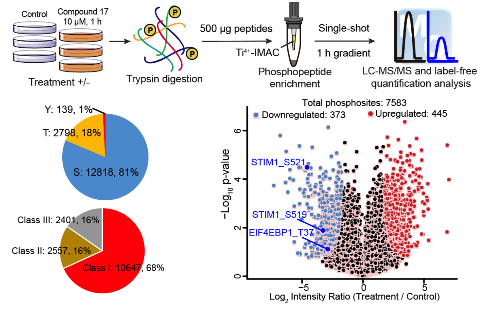 为了发现DYRK2新的生物学功能,该工作将C17作为一个特异而有效的探针,来研究哪些蛋白或信号通路受到DYRK2调控的影响。通过使用无标记的定量磷蛋白组学方法研究了C17处理后细胞磷酸化蛋白组的变化。在此,该研究通过对DYRK2的mRNA含量测序,寻找了一株在内源DYRK2基因高表达的骨髓瘤细胞系(U266)进行磷酸化蛋白质组学分析。结果表明,DYRK2参与复杂的磷酸化网络,通过直接、间接的作用调节蛋白质的磷酸化状态。在显著下调的位点中,该工作重点关注了两个重要的潜在底物蛋白,真核翻译起始因子结合蛋白1(4E-BP1)和基质相互作用分子1(STIM1)。